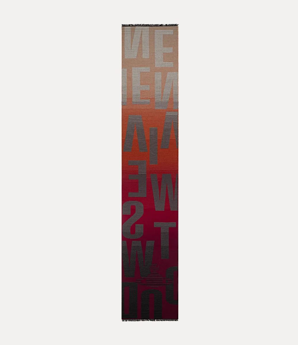 Šátek Vivienne Westwood zdobí odvážný žakárový vzor „Logomania“ této sezóny, tkaný v jemných přechodových tónech. Díky lehkým třásním po okrajích odráží tento kousek vizi Vivienne, která chce minulost přenést do budoucnosti.