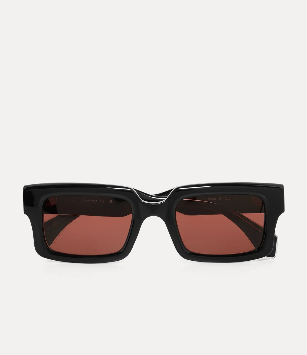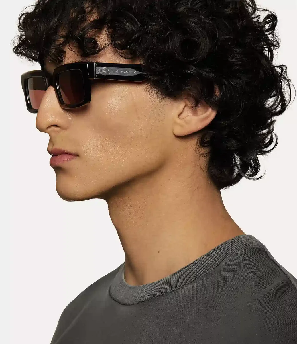 Silueta lesklých černých slunečních brýlí Costello je inspirována ikonickými kulturními osobnostmi divadelní a filmové scény. Výrazný design s robustními čtvercovými obroučkami a hnědými skly je umocněn složitými rohovými akcenty zdobícími vnější okraj, které připomínají ikonickou čelenku Horn Alice od Vivienne. Tvarované stranice jsou zdobeny motivy koulí na spáncích, zatímco kovové detaily na míru jsou zakončeny miniaturními rytinami koulí.