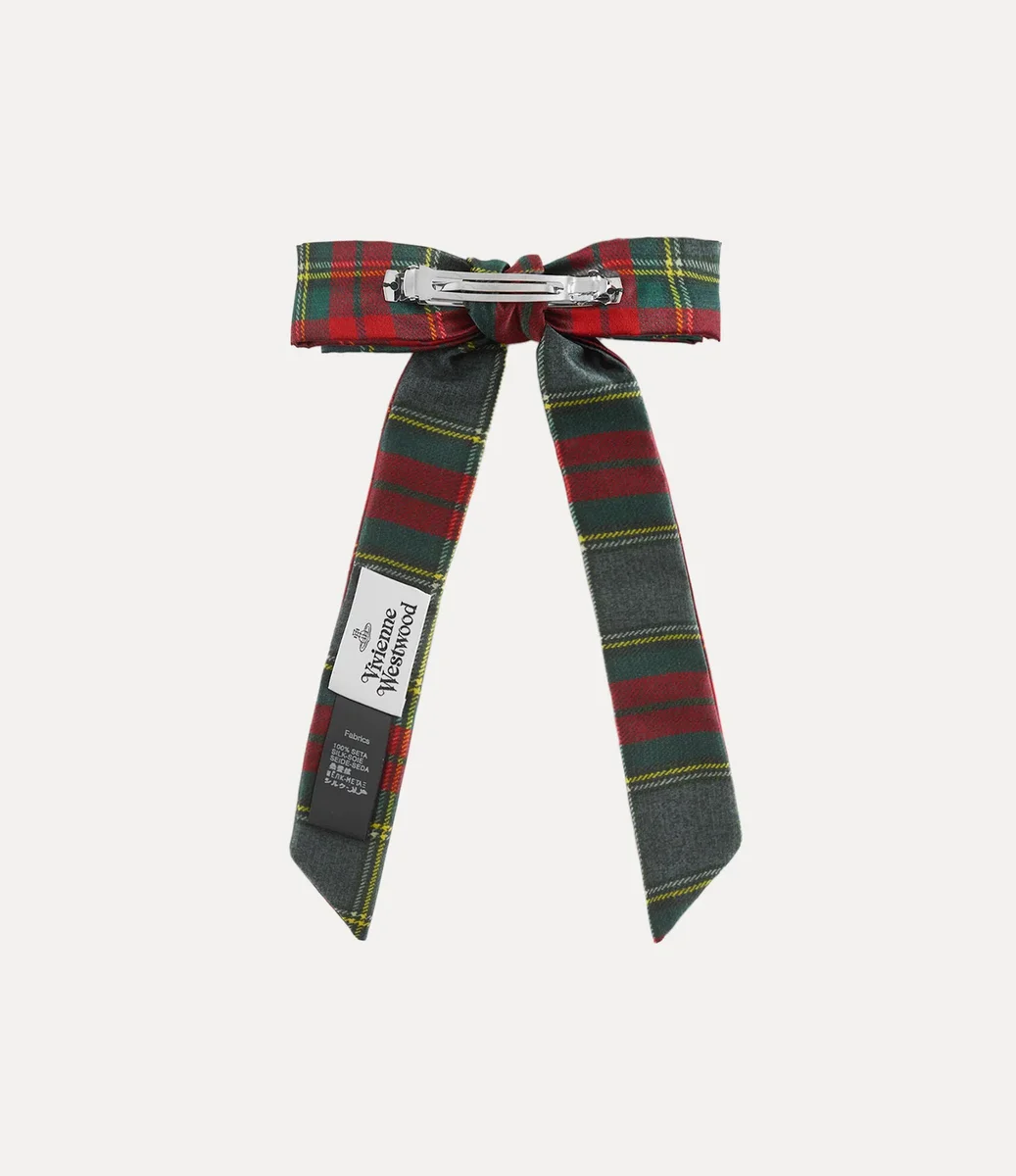Spona do vlasů Flyes má nadměrnou siluetu ve tvaru mašle, zdobenou tartanovým motivem „Scarlet“. Vrstvený design mašle je ručně dokončen klasickou výšivkou orb v barevných nitích, odrážející étos domu spojující minulost s budoucností.