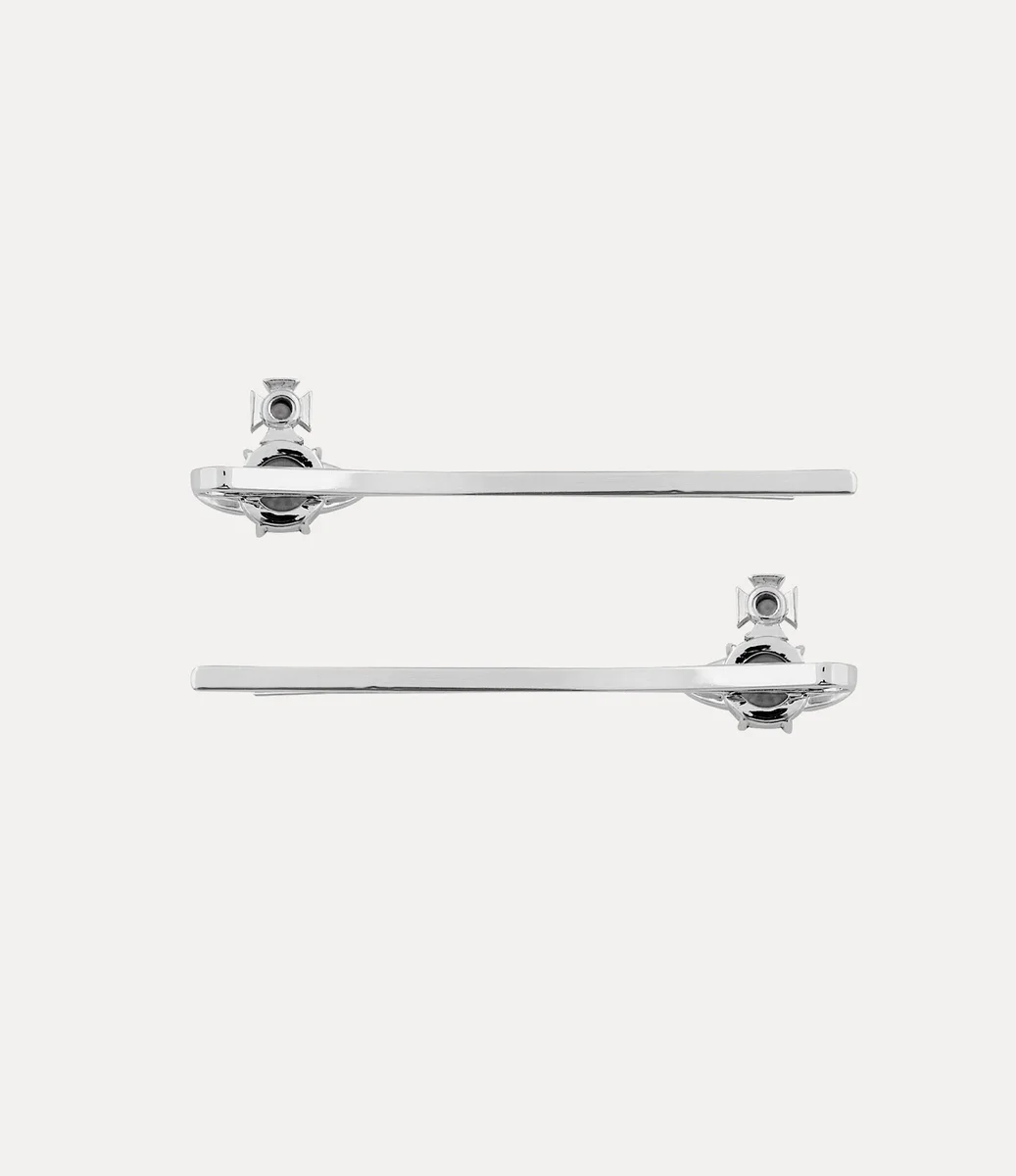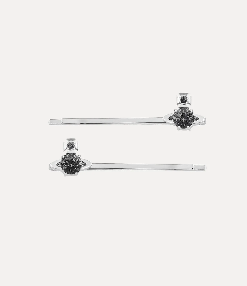 Naše sponky do vlasů Joaquina jsou v této sezóně k dispozici v leštěném stříbrném provedení. Design se vyznačuje výraznou dvourozměrnou koulí uprostřed, která je posázena šedými krystalovými detaily – připomínající Vivienninu vizi přenesení tradice do budoucnosti.