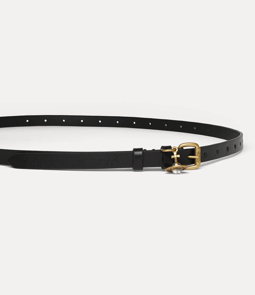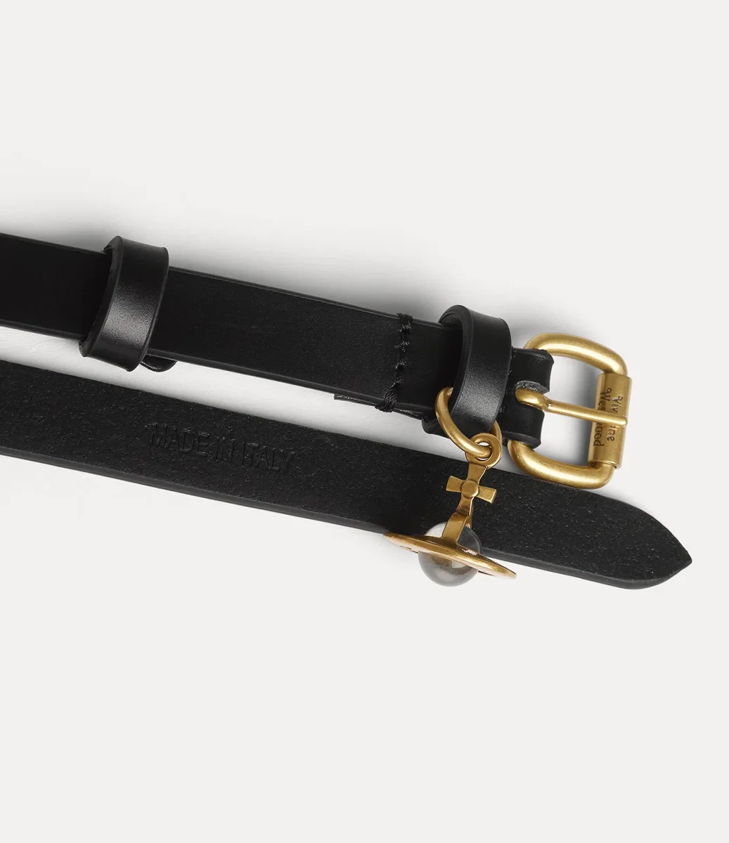 Náš pásek Mini Alex Charm se vyznačuje reliéfním písmenkovým motivem podél siluety z měkké kůže, doplněným rolovací sponou v antické zlaté barvě. Na přední smyčce je umístěna celokovová visící koule, která symbolizuje vizi Vivienne přenést tradici do budoucnosti.
