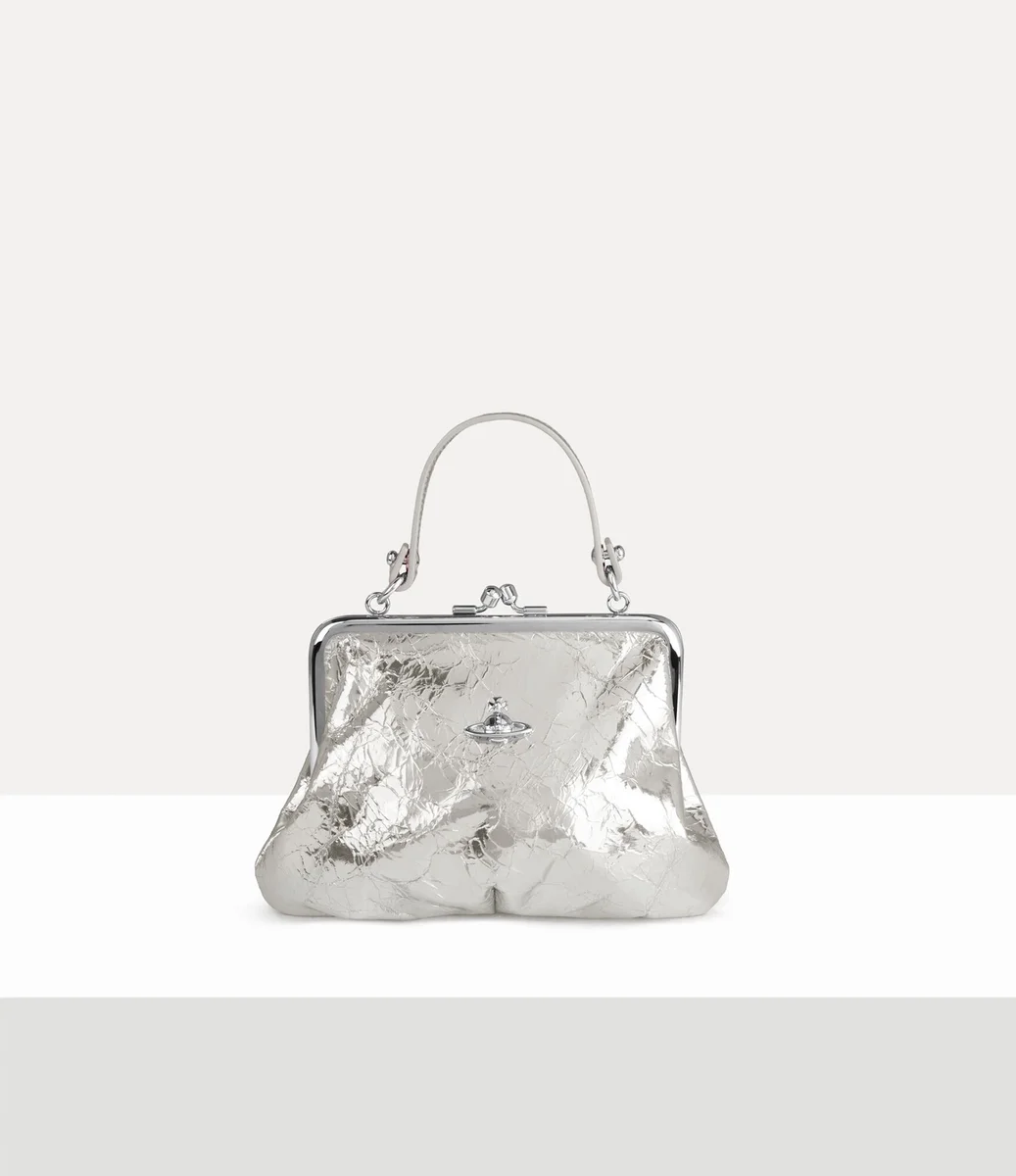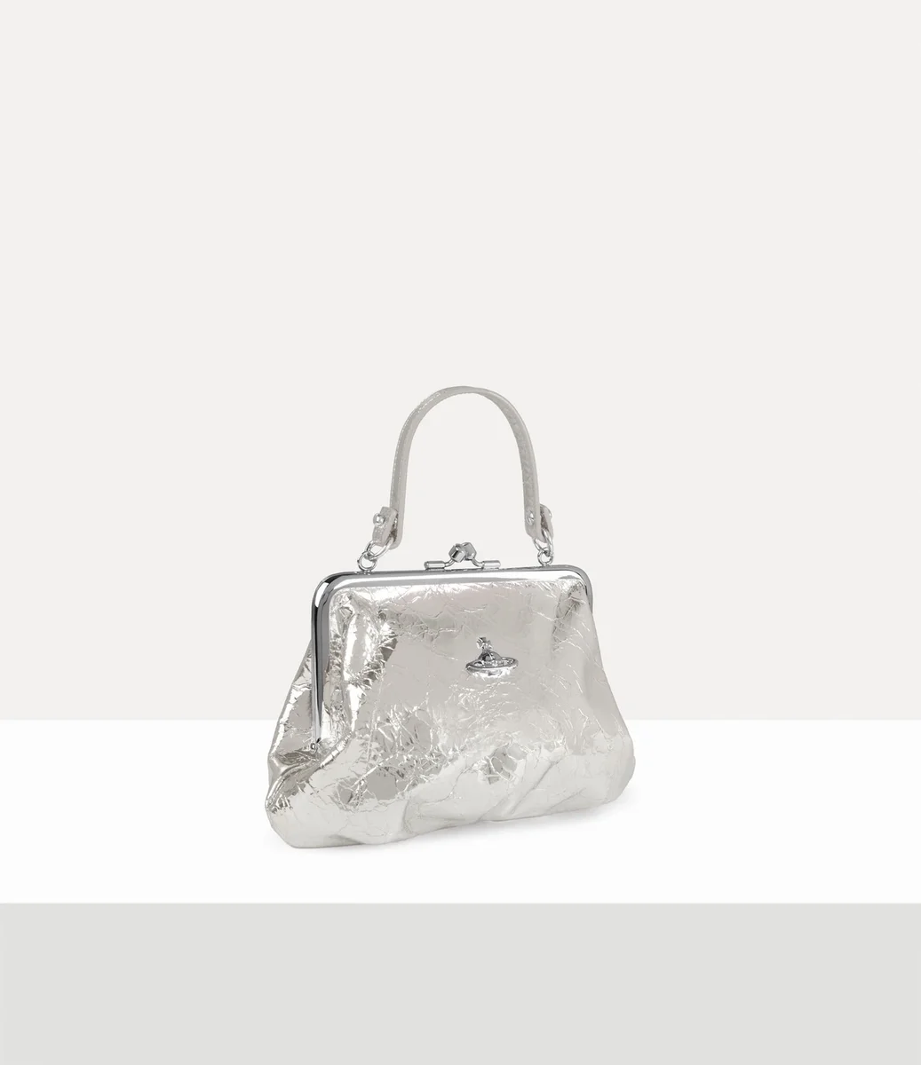 V této sezóně je naše charakteristická kabelka Granny Frame přepracována z metalické kůže s efektem zvrásnění, čerpající z bohatého archivu značky. Díky detailům v podobě leštěného rámu a zapínání na zip v horní části připomíná kabelka peněženky z počátku 20. století.