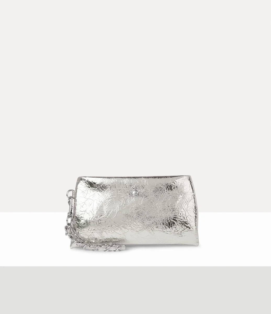 Pouzdro na zápěstí Sadie bylo přepracováno z metalické kůže s vrásčitým efektem, čerpající z bohatého archivu značky. Design se vyznačuje stříbrným řetízkem propleteným s tónovými koženými detaily a doplněným leštěným motivem koule na přední straně – synonymem pro vizi Vivienne, která chce tradici přenést do budoucnosti.