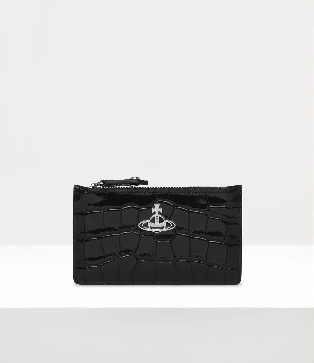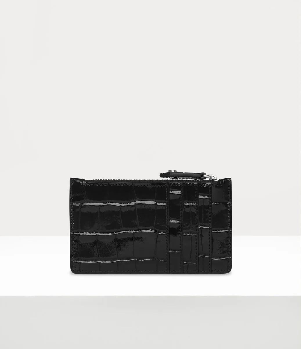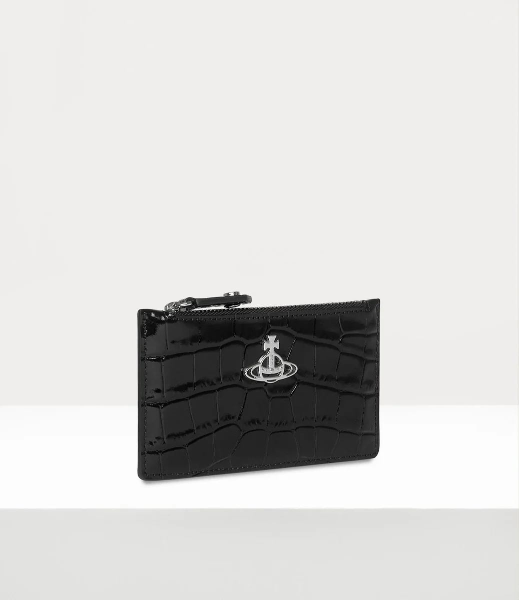 Krátká dlouhá peněženka na karty je vyrobena z kůže s krokodýlí reliéfní povrchovou úpravou a má gravírované zapínání na zip, čtyři přihrádky na karty na zadní straně a podšívkovou verzi našeho motivu orb na přední straně ve stříbrných tónech.