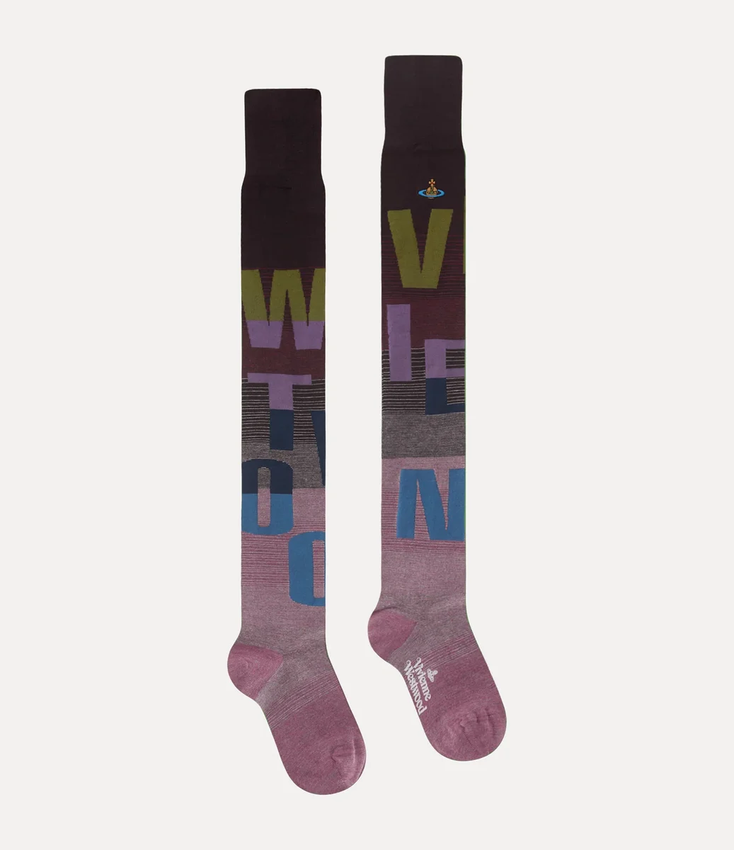 Ponožky Over The Knee nabízejí nápadný žakárový vzor „Logomania” této sezóny a jsou vyrobeny z extra jemné směsi merino vlny. Ponožky jsou zdobeny vyšívaným motivem orb v různých barvách, který symbolizuje tradici, obklopený nebeskými prstenci Saturnu, symbolizujícími budoucnost.