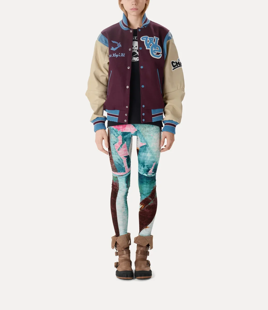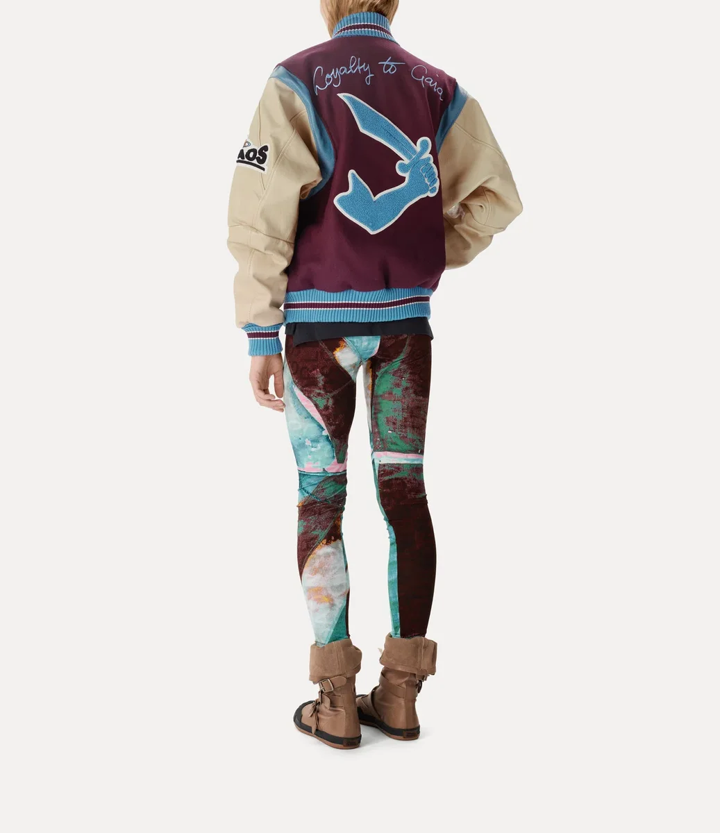Naše bunda Worlds End Letterman má střih inspirovaný bomberem, kožené rukávy a kontrastní žebrované lemy. Na přední straně je zdobena motivem paže a šavle a adresou našeho butiku Worlds End, zatímco na zadní straně je nápis „Loyalty to Gaia“ (Věrnost Gaie) – odkaz na Viviennin závazek k aktivismu v oblasti klimatu.
