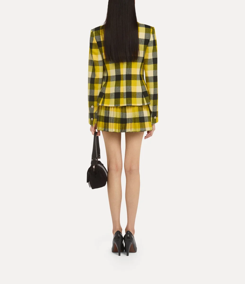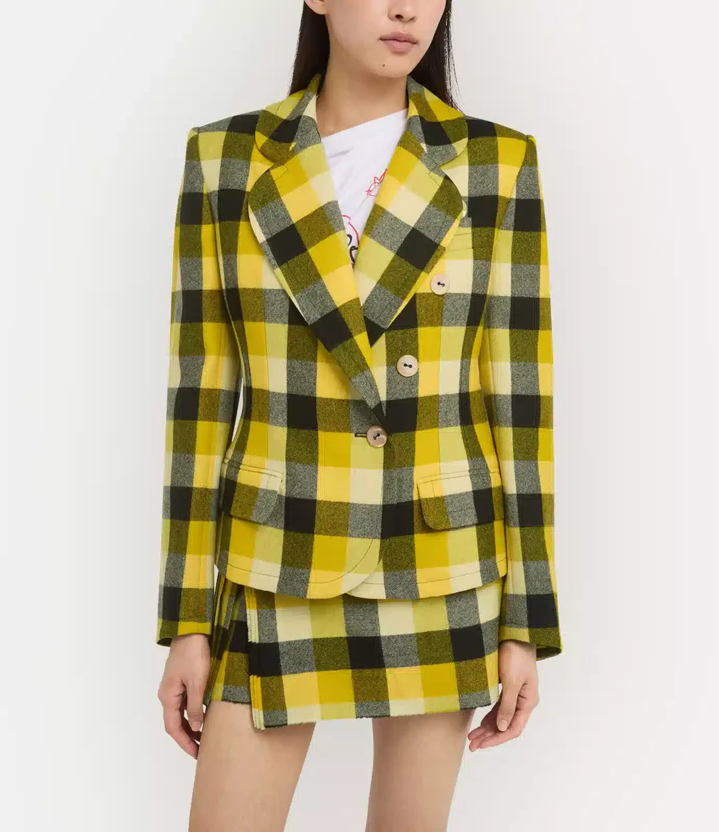 Sako Vivienne Westwood Georgia, vyrobené z vlny, zdobí motiv kostky „Pixel“ aktuální sezóny a zapíná se na perleťový knoflík.