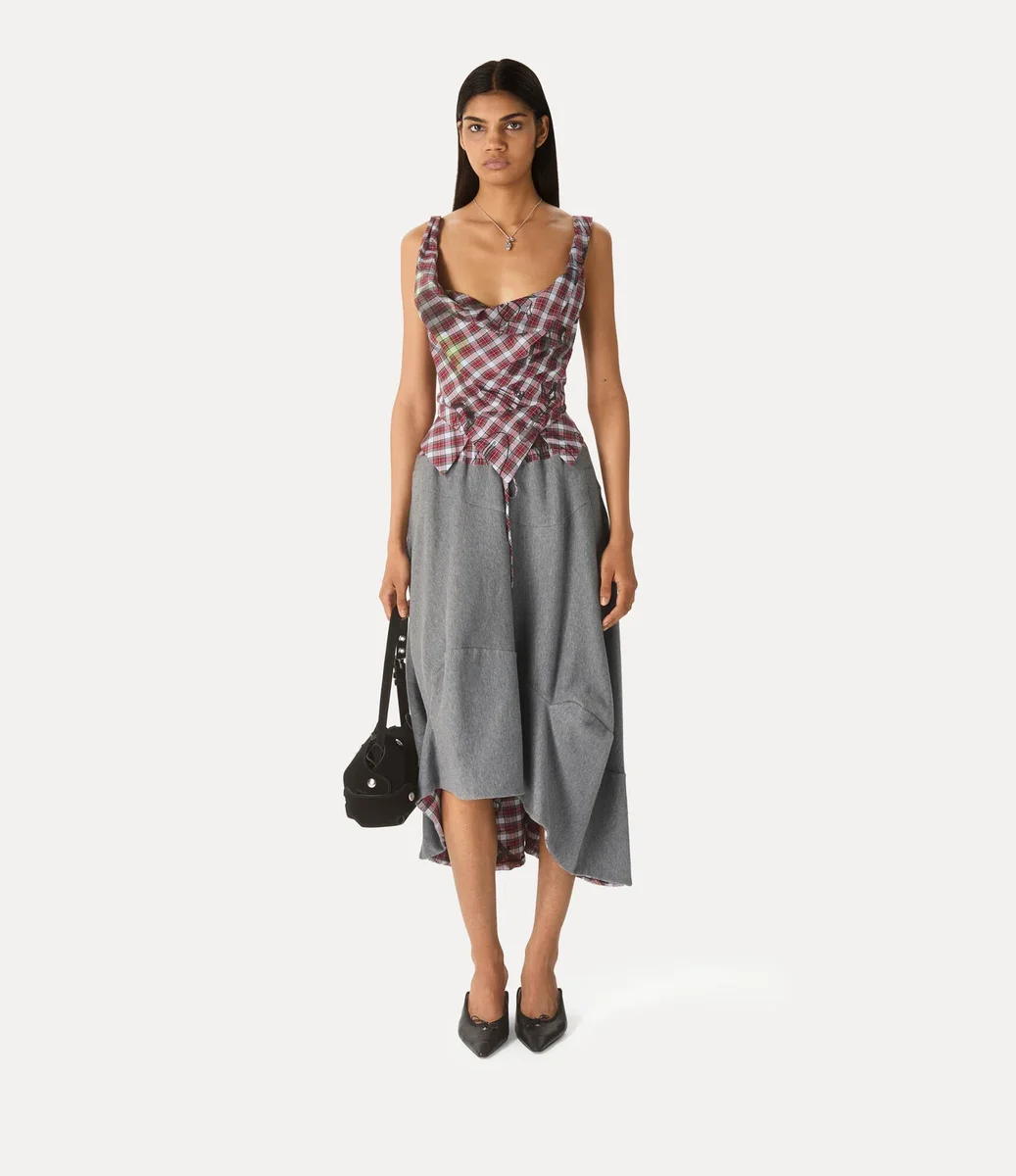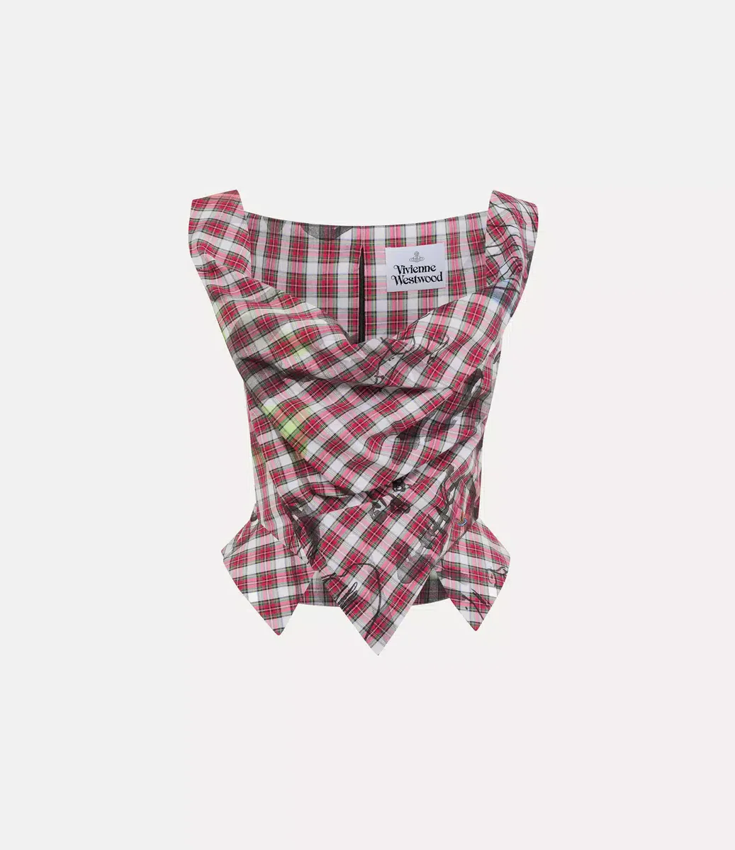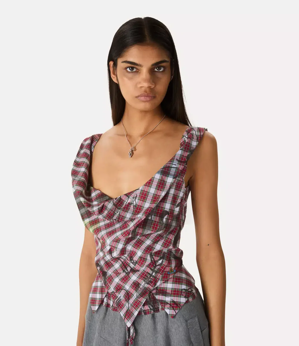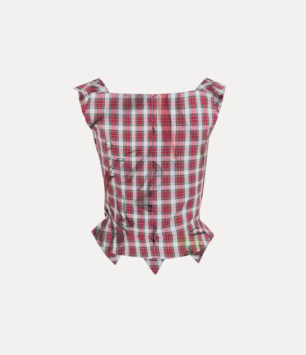 V této sezóně je náš top Sunday ušit z látky s potiskem červeného tartanového kostkovaného motivu, který evokuje klasickou domácí estetiku. Design, který je potištěn ručně kreslenými ilustracemi Dominica Myatta a zdobený zářivými graffiti spreji, je poctou punkovému duchu „DIY“ naší značky.