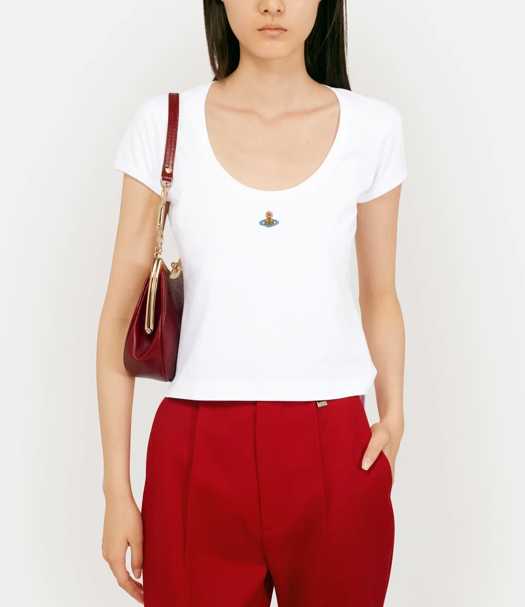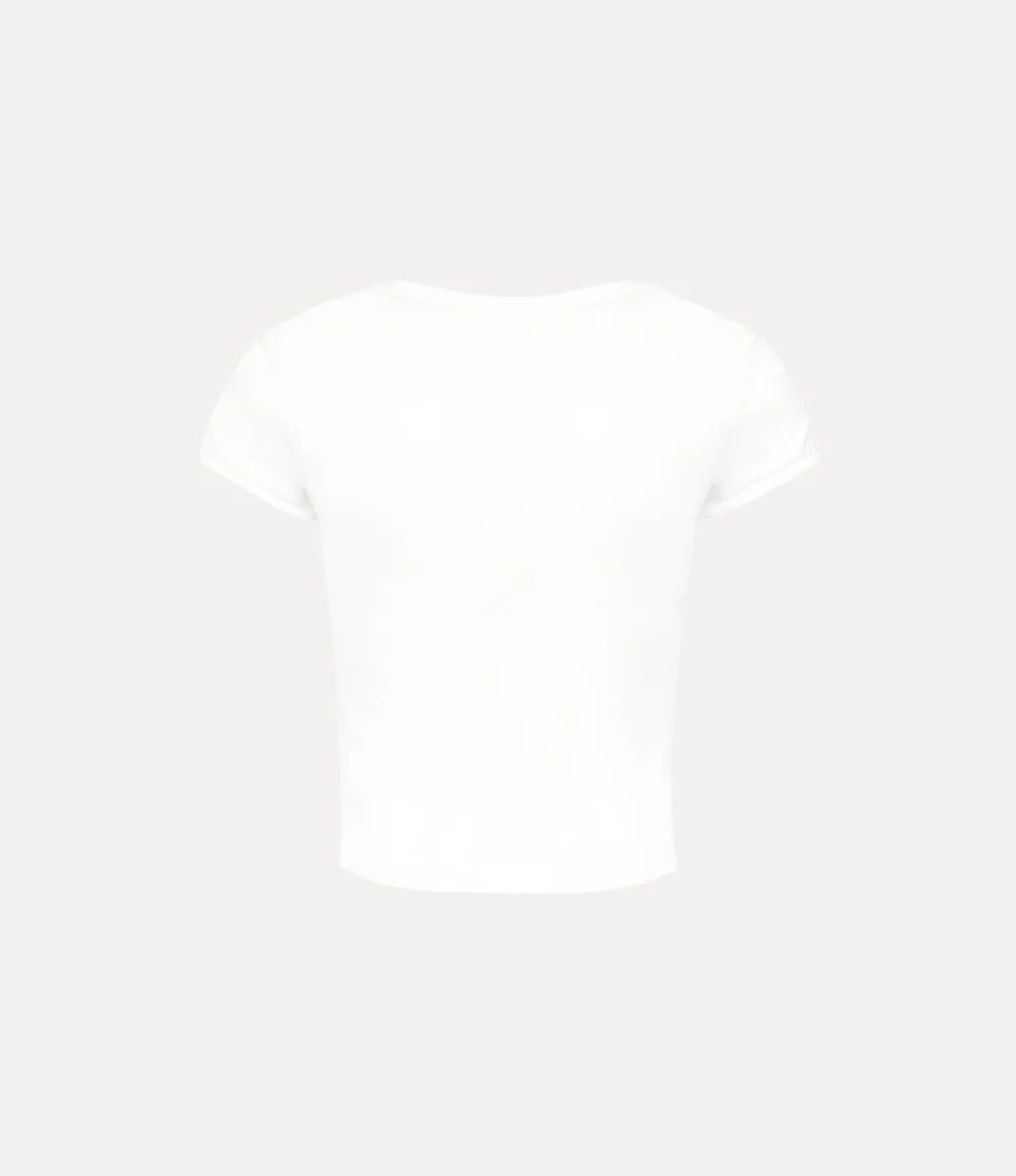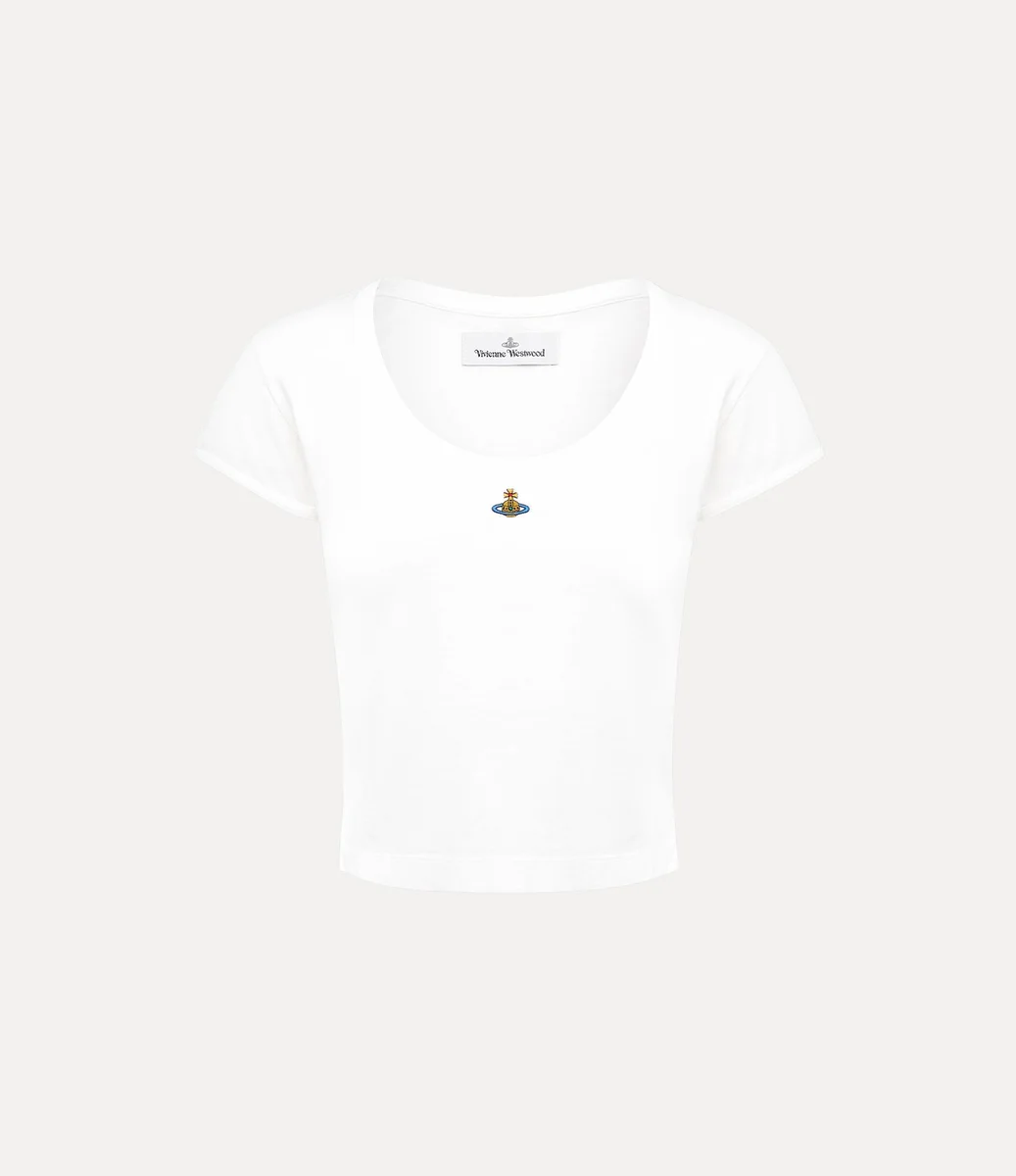 Naše tričko Micro Lollo má zkrácený bavlněný střih, krátké rukávy a hluboký výstřih. Na střední části hrudníku je vyšívaná vícebarevná koule, která symbolizuje tradici, obklopená nebeskými prstenci Saturnu, které představují budoucnost.