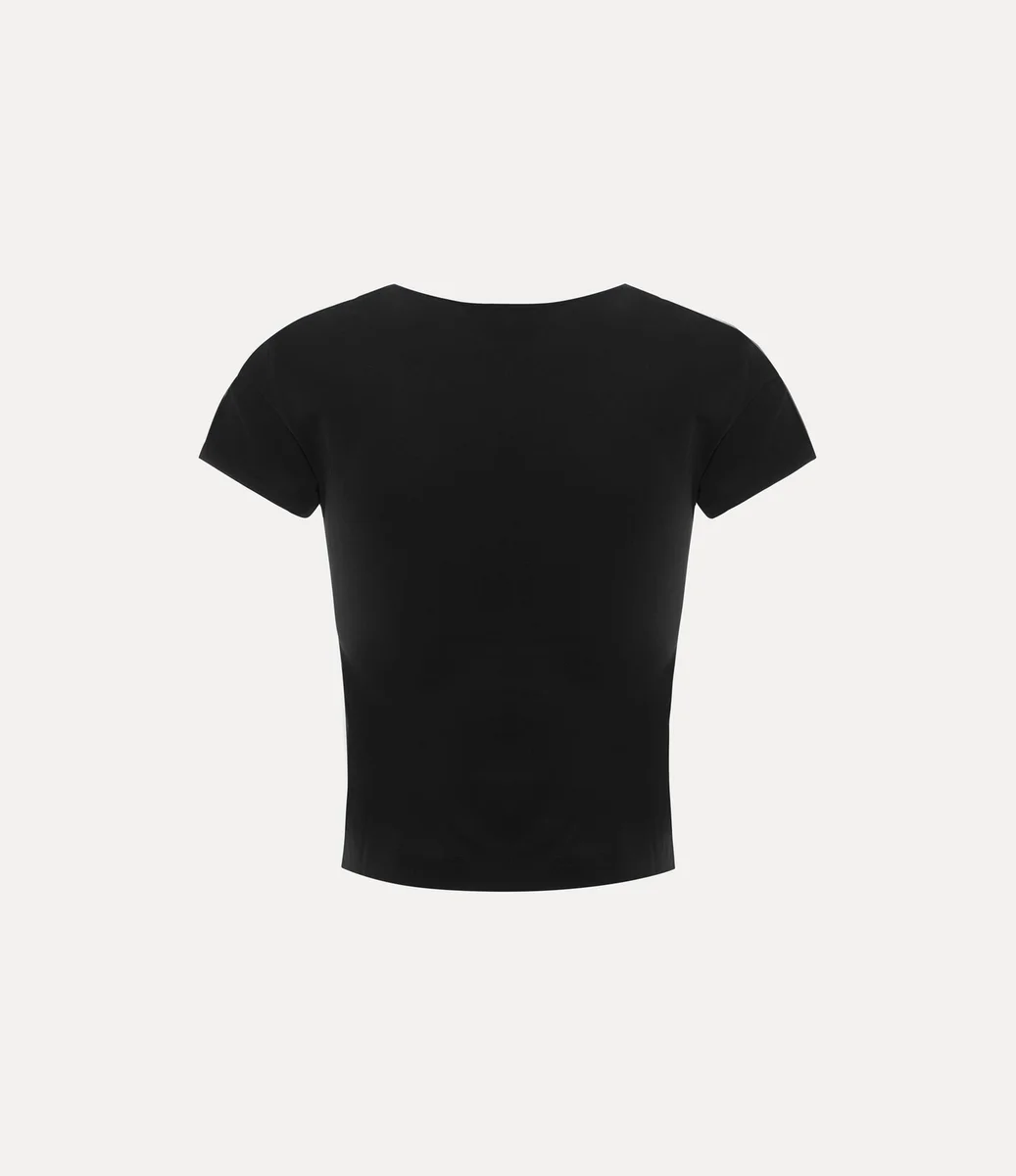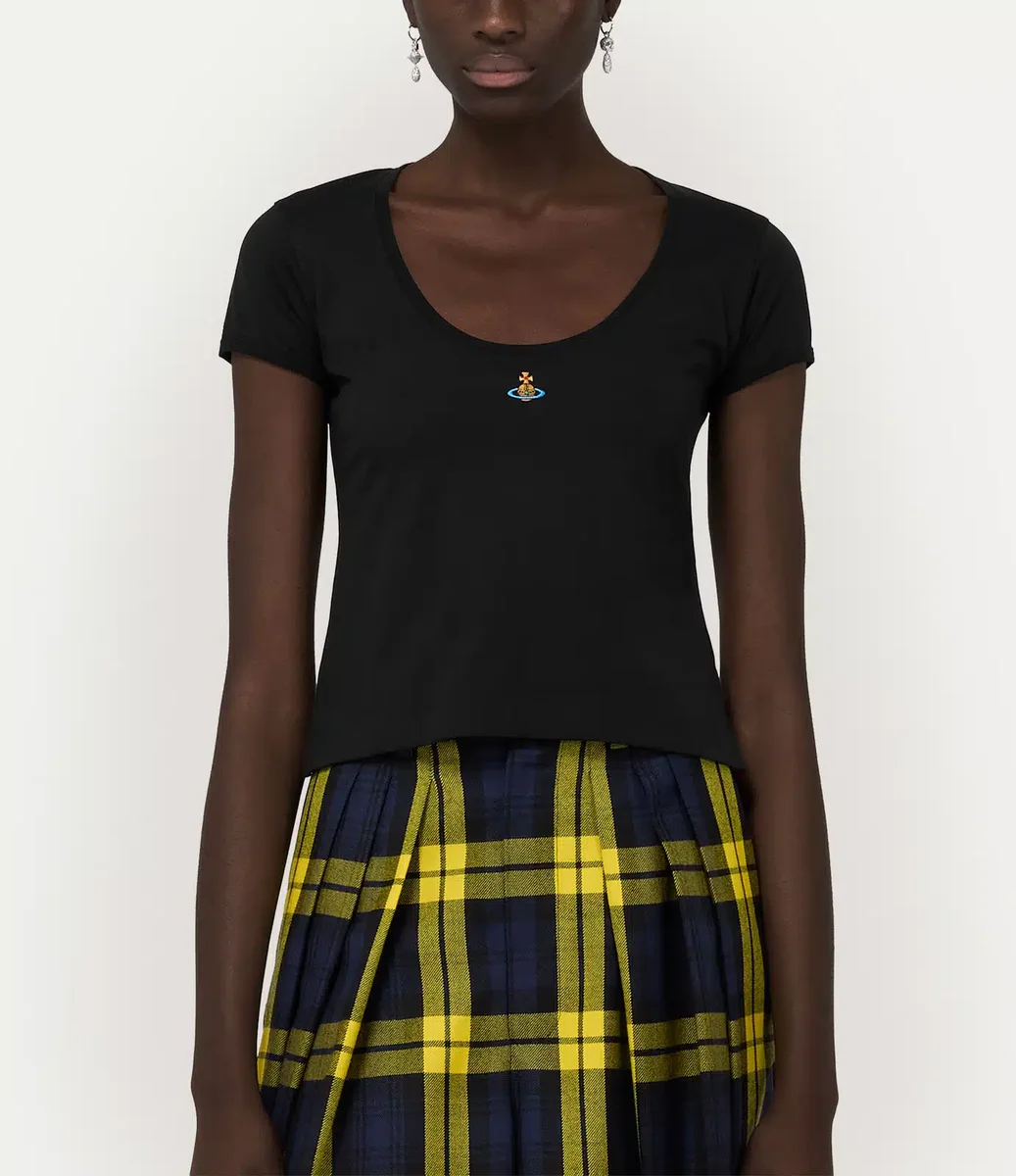 Naše tričko Micro Lollo má zkrácený bavlněný střih, krátké rukávy a hluboký výstřih. Na střední části hrudníku je vyšívaný vícebarevný symbol kruhu, který symbolizuje tradici, obklopený nebeskými prstenci Saturnu, které představují budoucnost.