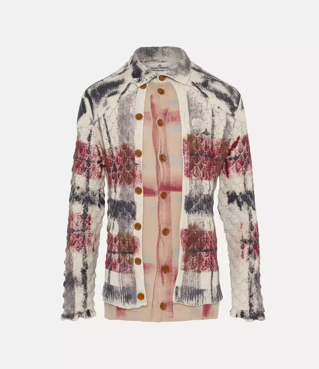 Dvojitý tartanový svetr je vyroben z vlněné a bavlněné směsi a skládá se ze dvou jedinečných vrstev. Vnější vrstva je pletená jemným diamantovým stehem, zatímco vnitřní vrstva je pletená plochým stehem – obě vrstvy jsou zakončeny ručně nanesenými tartanovými potisky a patinovaným povrchem.