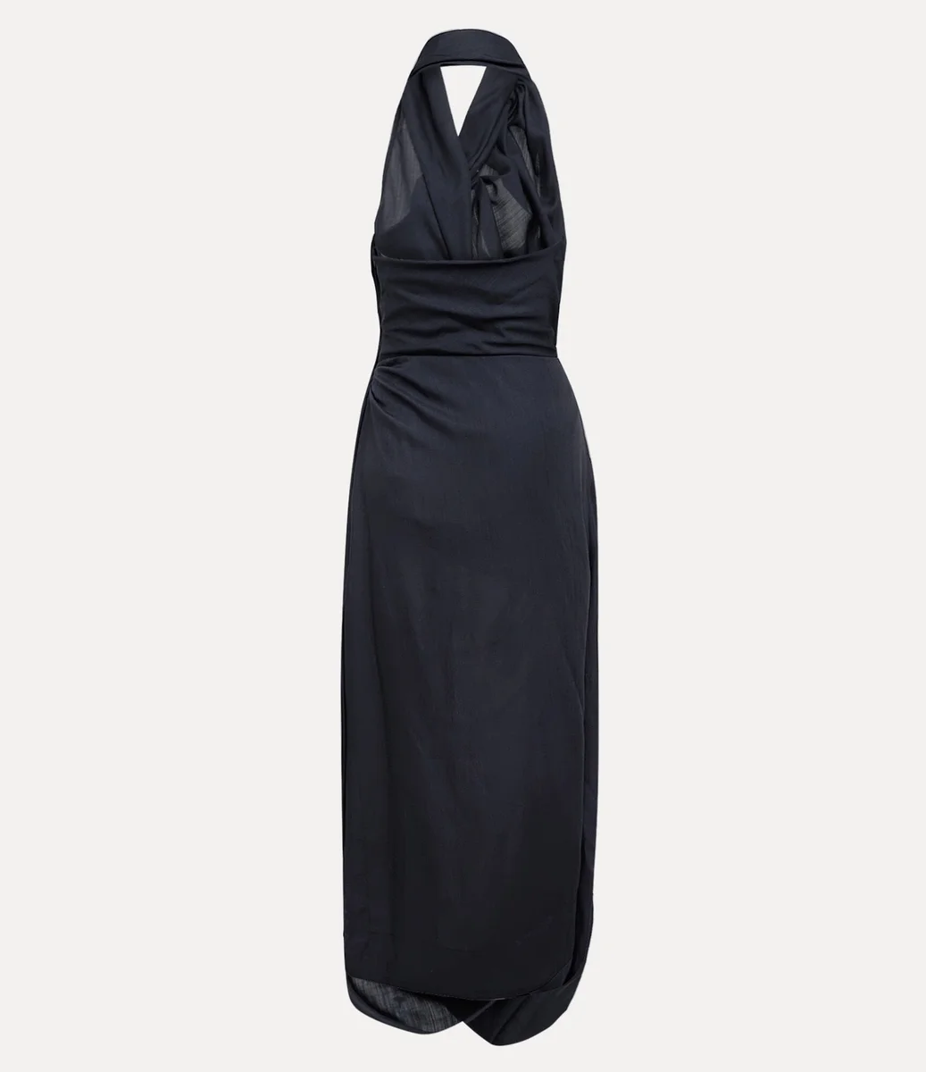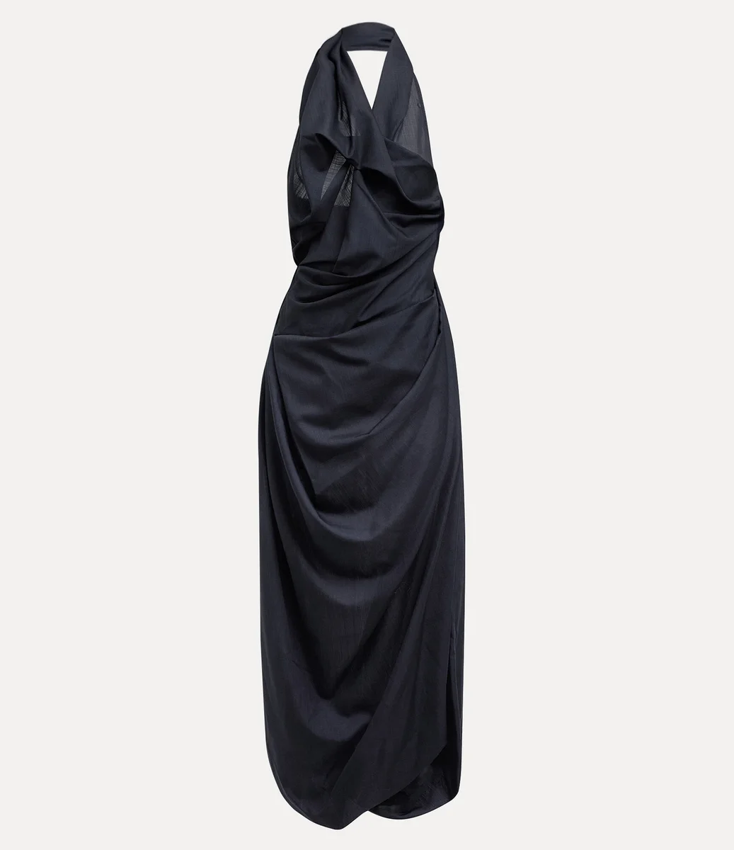 Šaty Vivienne Westwood Halter Galatea se ovíjejí kolem těla v několika vrstvách lehké, průsvitné vlny a jsou zakončeny zkroucenými švy.