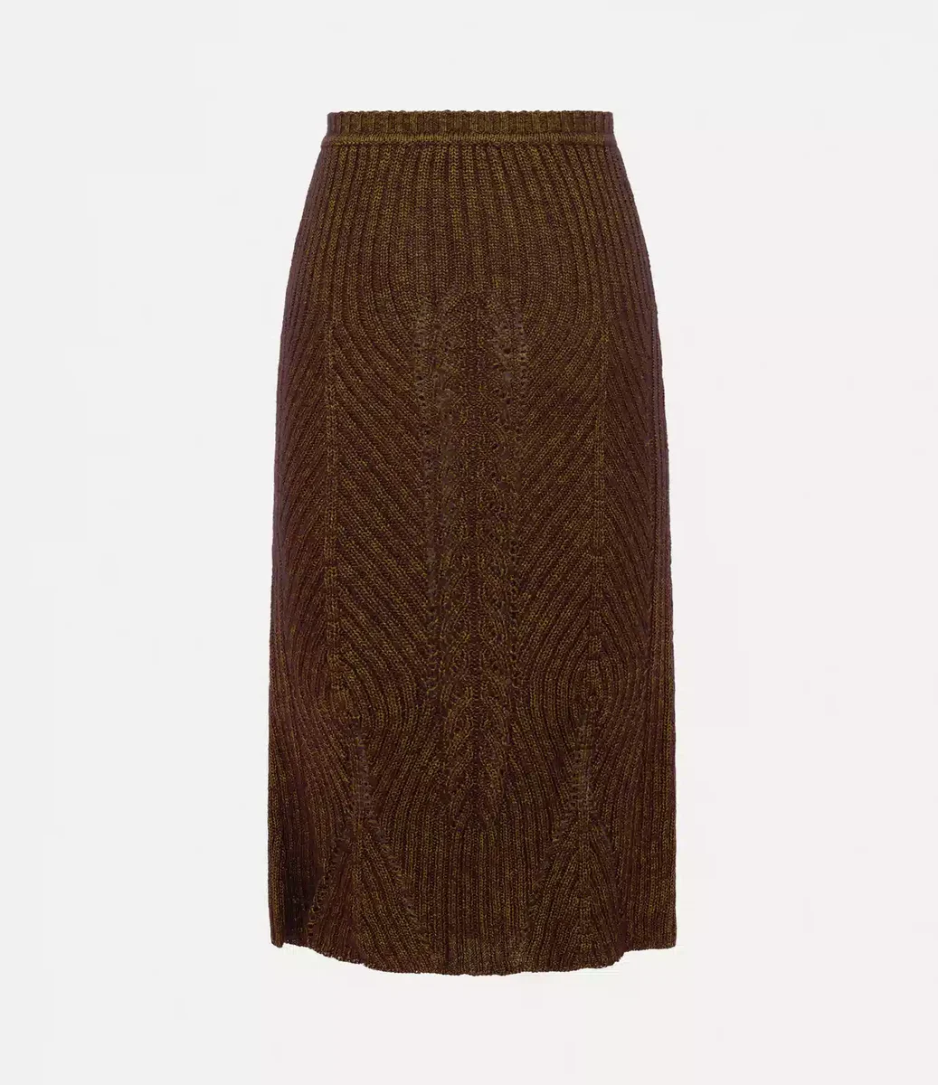 Středně dlouhá sukně Mary je vyrobena ze směsi hedvábí a mohéru a vyznačuje se jedinečnou kombinací rybí kosti a žebrovaného úpletu. Design nabízí žebrovaný pas a jemnou siluetu ve tvaru písmene A, kterou vytváří struktura úpletu. Vícebarevná vyšívaná koule na lemu odráží étos značky, který spočívá v přenesení minulosti do budoucnosti.