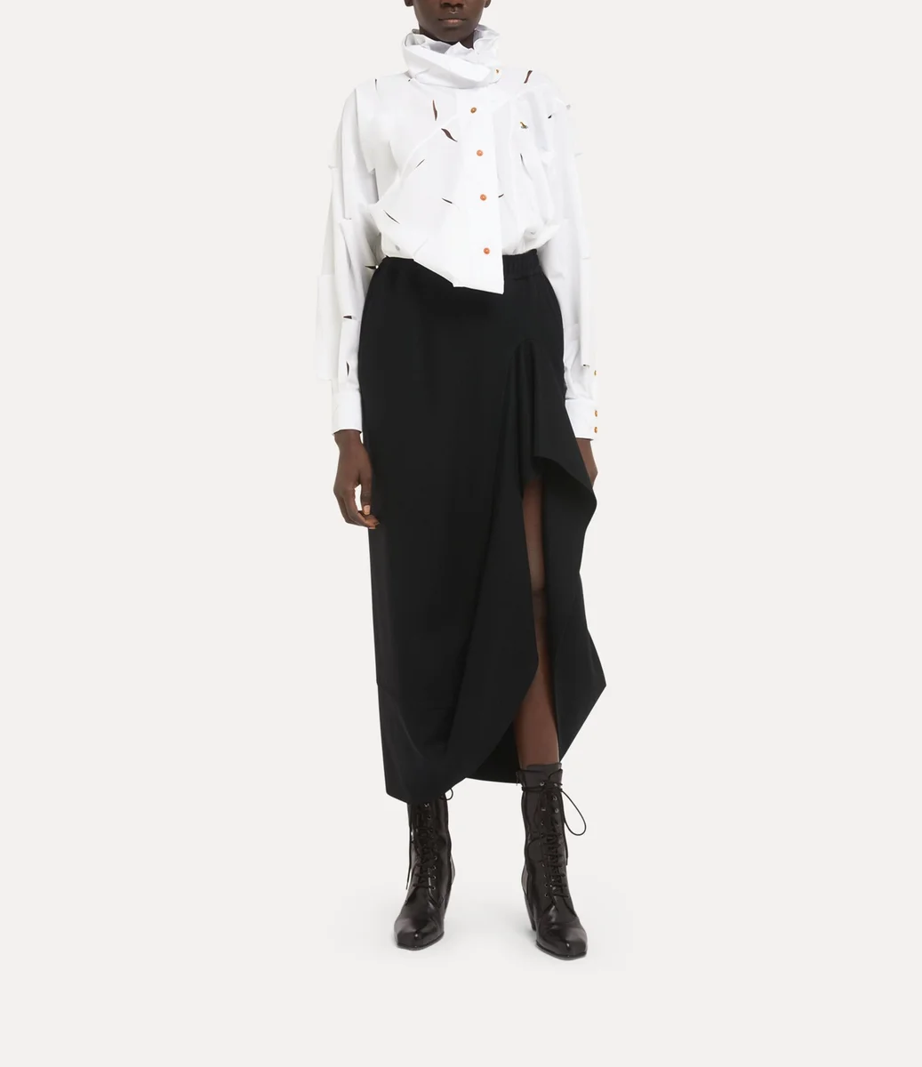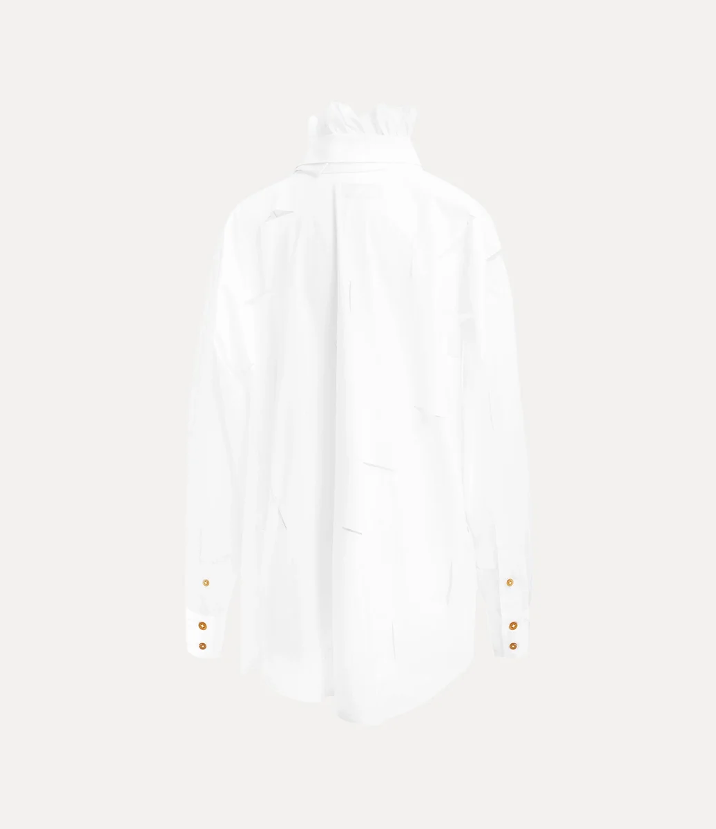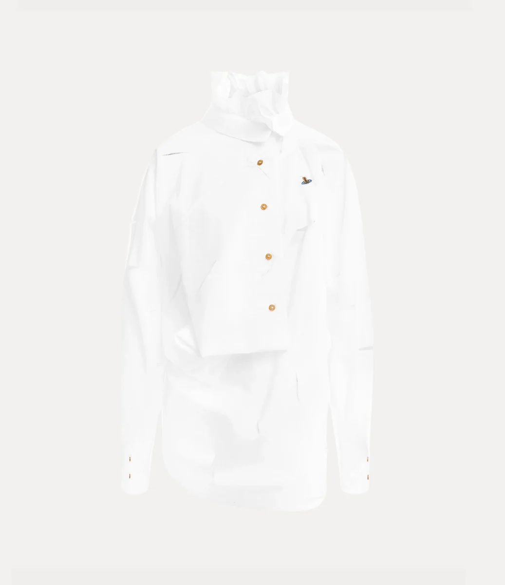 Naše halenka Halston, inspirovaná portréty z období Tudorovců, má vysoký volánový límec, který se zapíná na dva knoflíky. Měkké, sochařské drapérie elegantně padají po těle, zatímco složitý detail řezů zdobí design – charakteristický prvek, který byl poprvé představen v kolekci Vivienne Westwood jaro–léto 1991 „Cut, Slash and Pull”.