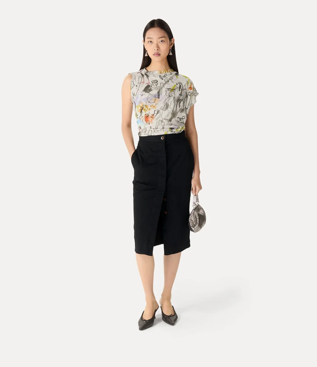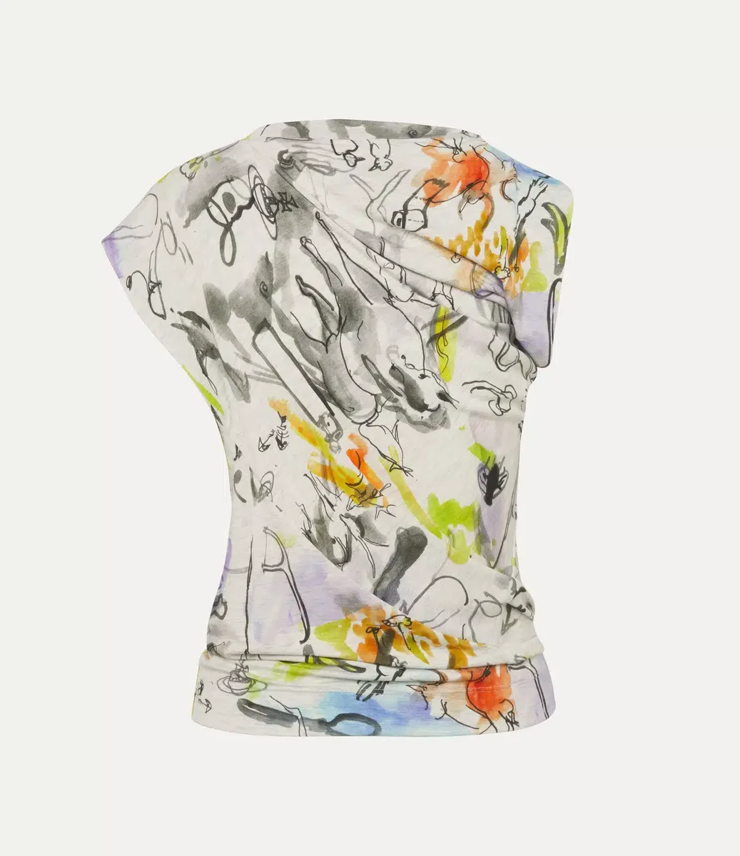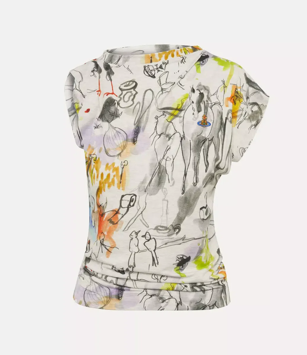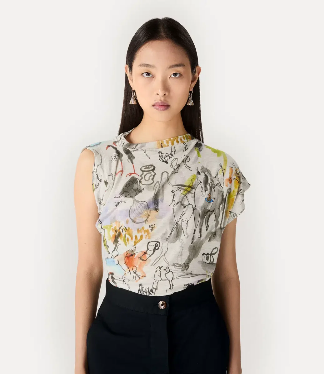 Náš charakteristický top Hebo je vyroben z měkké bavlněné směsi a potištěn motivem „Wonderland“ pro tuto sezónu, doplněným sérií složitých ručně kreslených motivů vrstvených malířskými akvarelovými skvrnami v živých tónech. Vyšívaný vícebarevným motivem koule, tento kousek připomíná Vivienninu vizi přenesení tradice do budoucnosti.