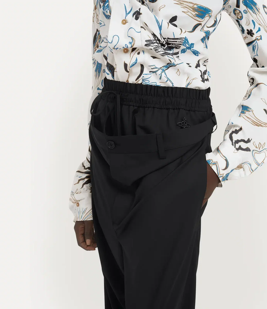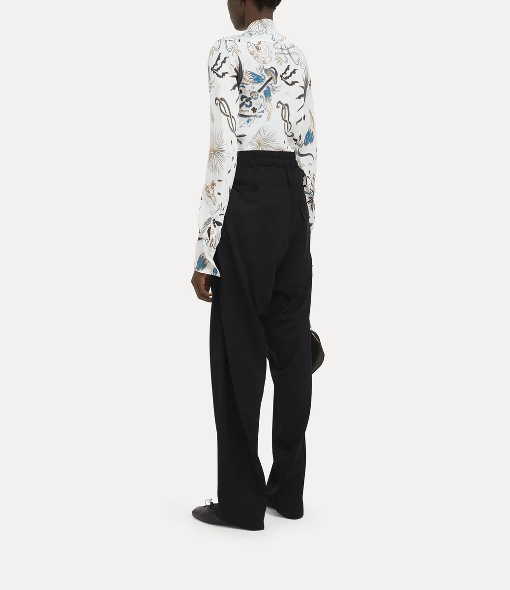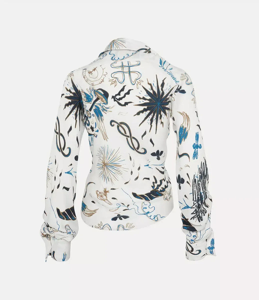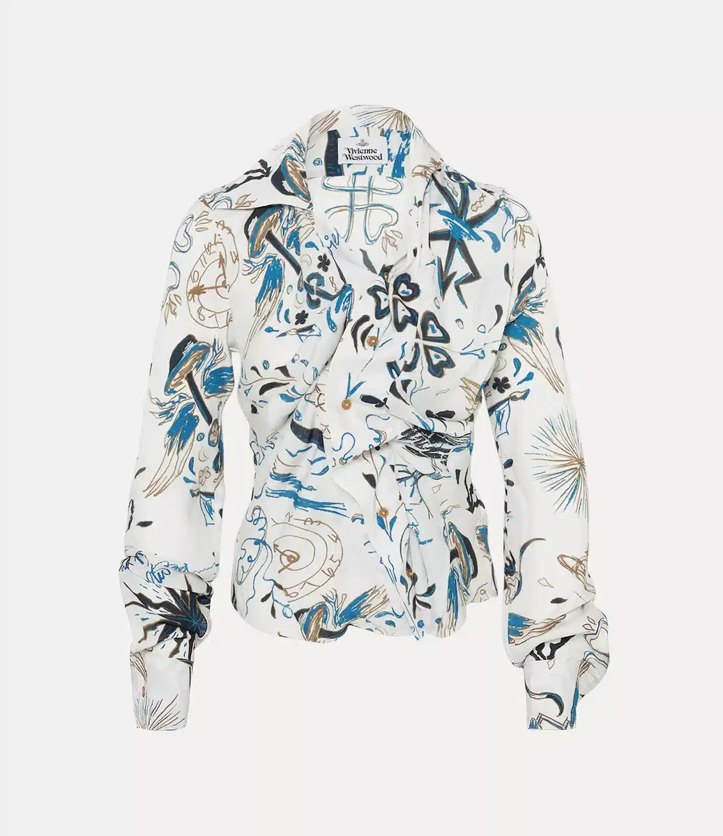 Naše košile Drunken, navržená pomocí experimentálního systému Vivienne, je střižena s excentrickým zapínáním na knoflíky a asymetrickým lemem. Inspirována obrazem „The Laughing Cavalier“ od Fransa Halse, je potištěna abstraktním grafickým vzorem, který zahrnuje charakteristickou ikonografii značky.