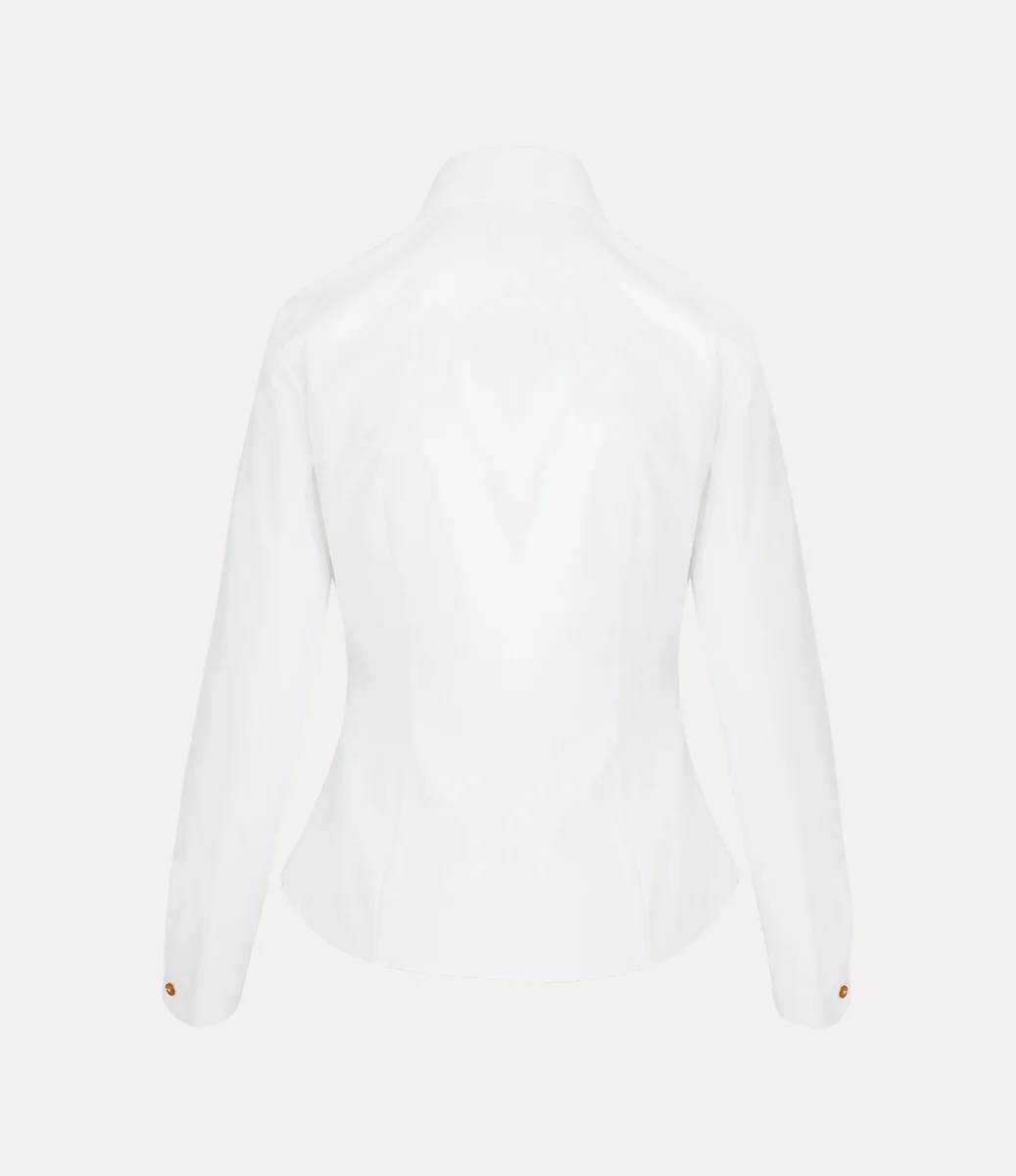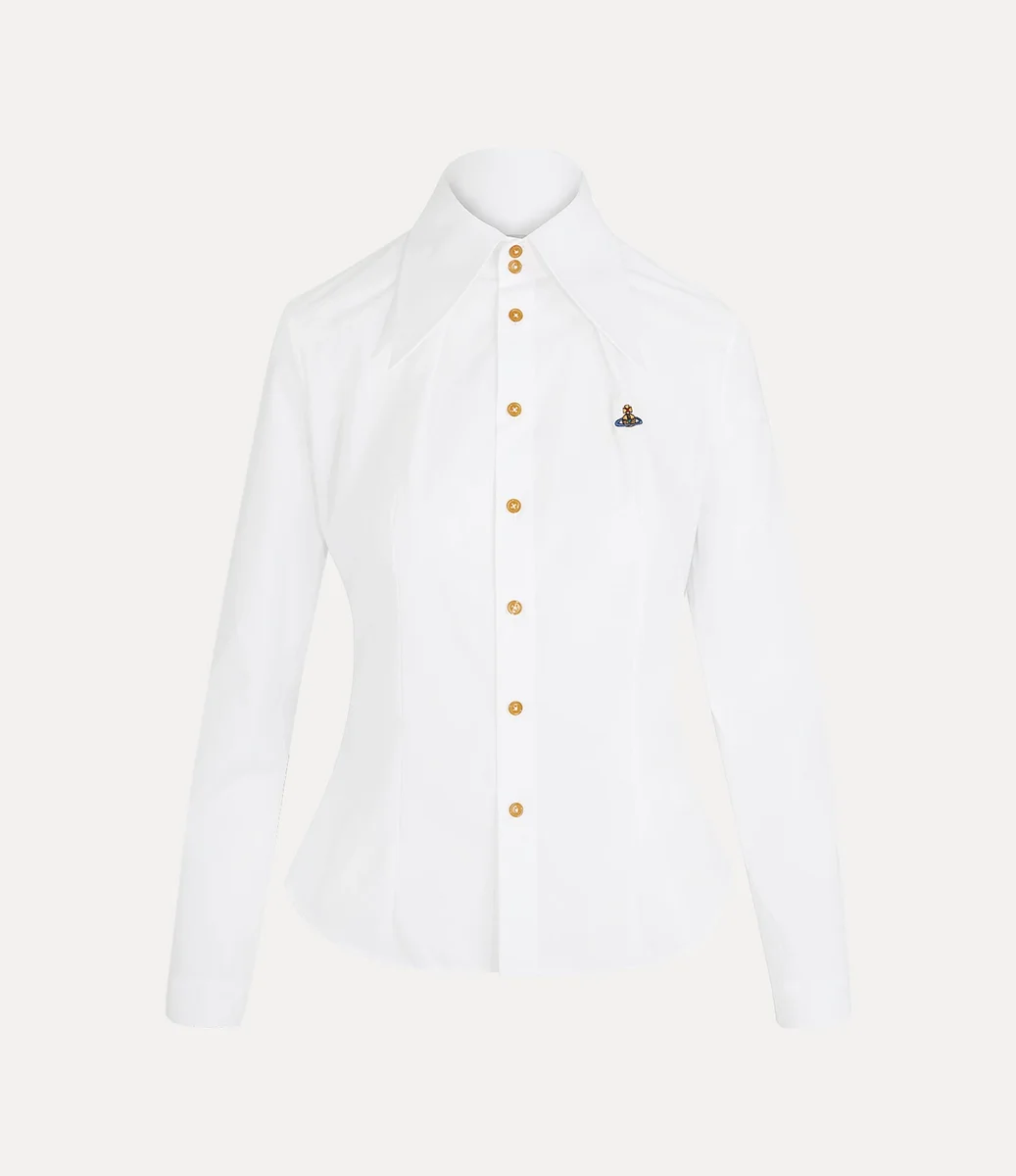 Košile Vivienne Westwood W Violin má výrazný límec se špičatými okraji, doplněný naším charakteristickým zapínáním na tři knoflíky a vyšívaným motivem koule.