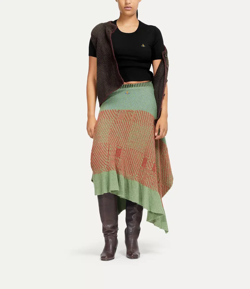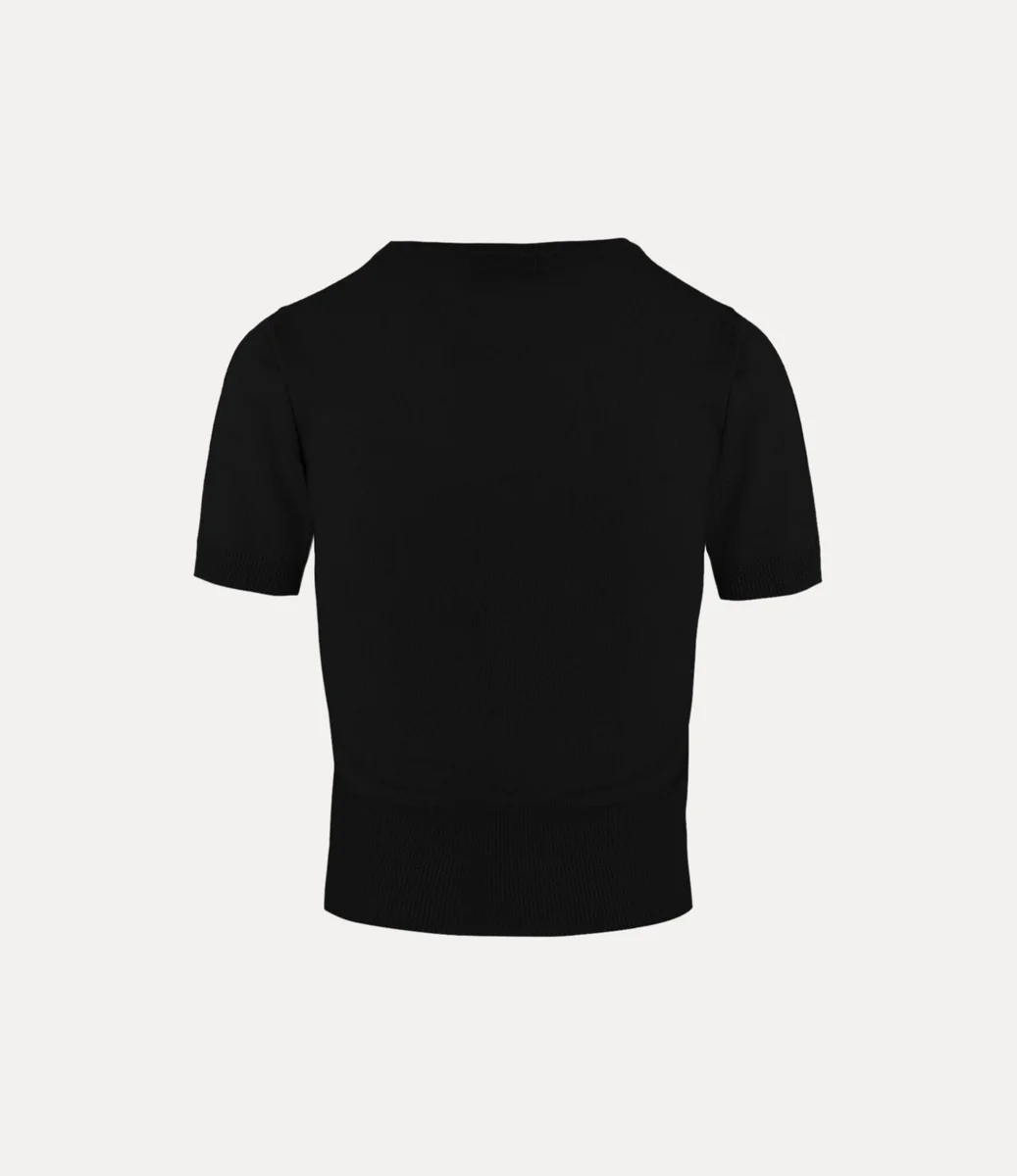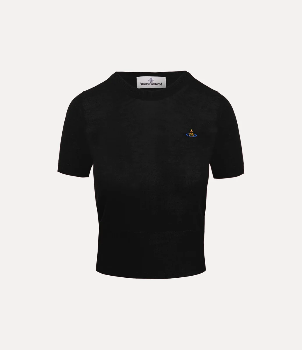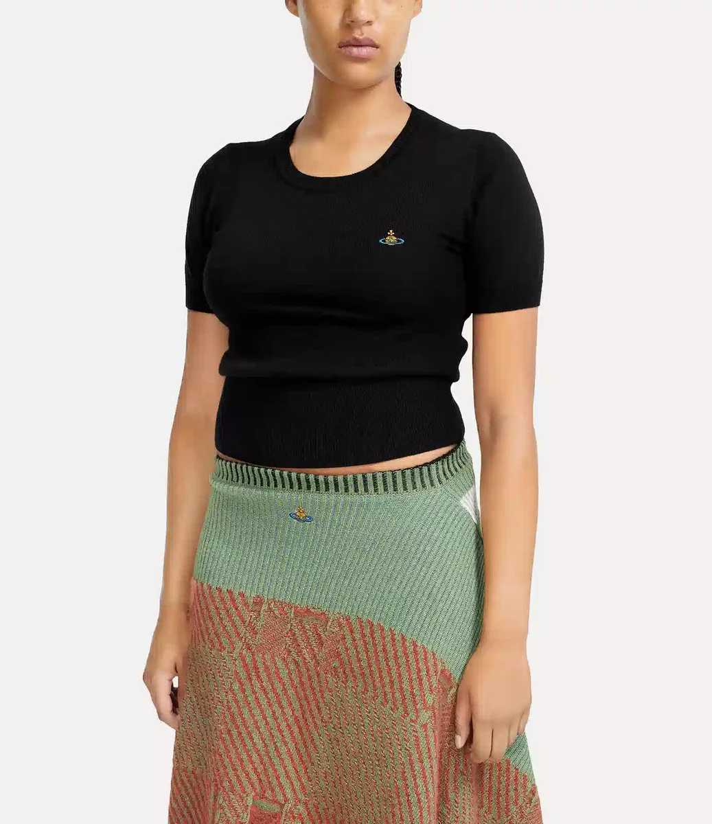 Náš top Bea prošel v této sezóně obnovou. Tento top s krátkými rukávy z vlněno-hedvábné směsi, který je součástí naší klasické kolekce, má žebrované lemy a vyšívanou barevnou kouli na hrudi – symbolizující vizi Vivienne přenést tradici do budoucnosti.