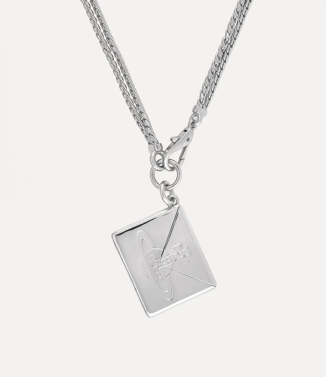 Náš náhrdelník Valentine’s Envelope Pendant má dvojitý řetízek ze stříbrného pokoveného kovu, zdobený černými patinovými detaily. Na přední straně je náš charakteristický motiv koule, symbol Vivienniny vize přenesení tradice do budoucnosti, zatímco na zadní straně je vyryto logo vlajkové lodi Vivienne Westwood. Náhrdelník se otevírá a odhaluje uvnitř odlitý dopis s upřímným vzkazem „Miluji tě“.