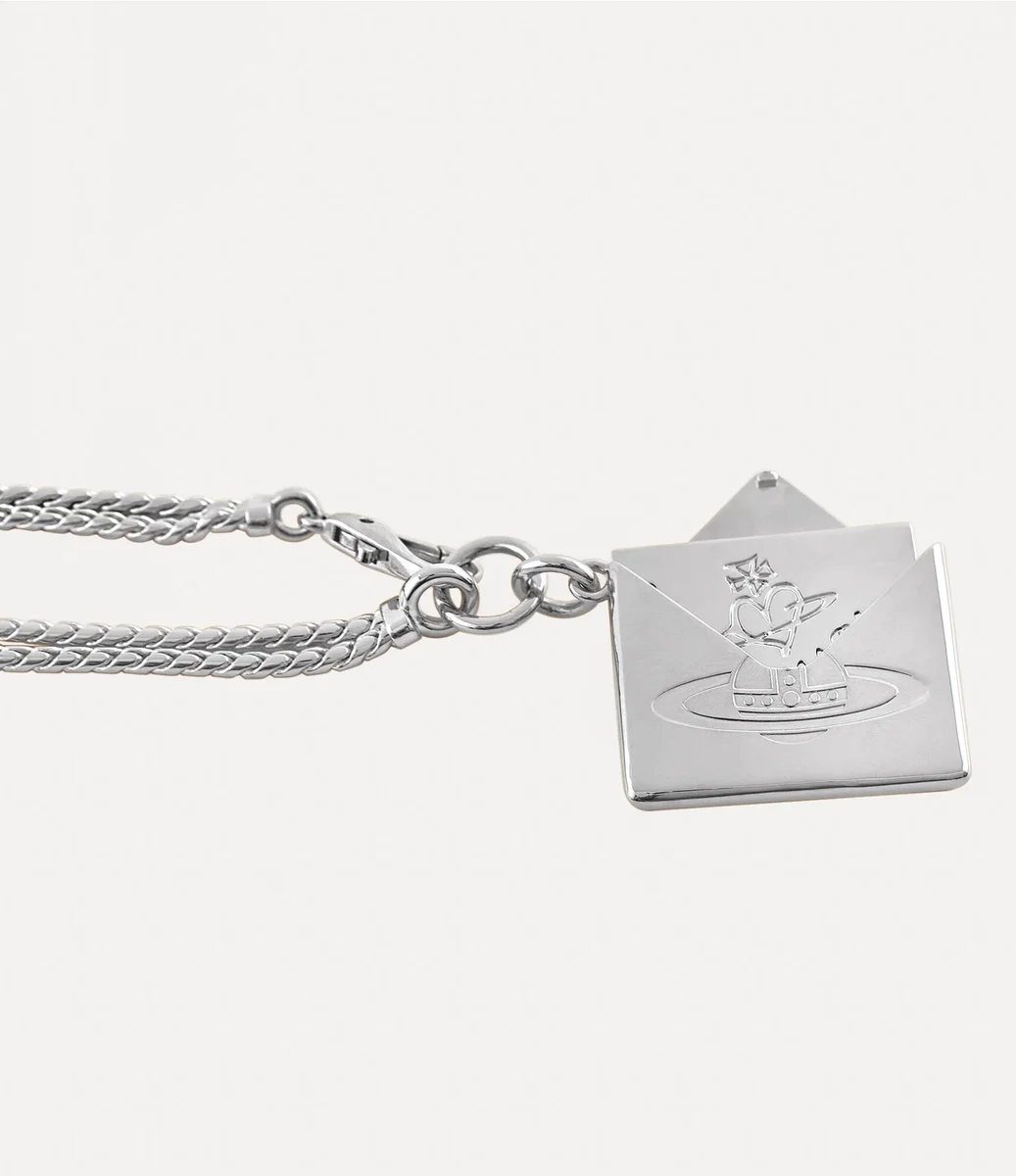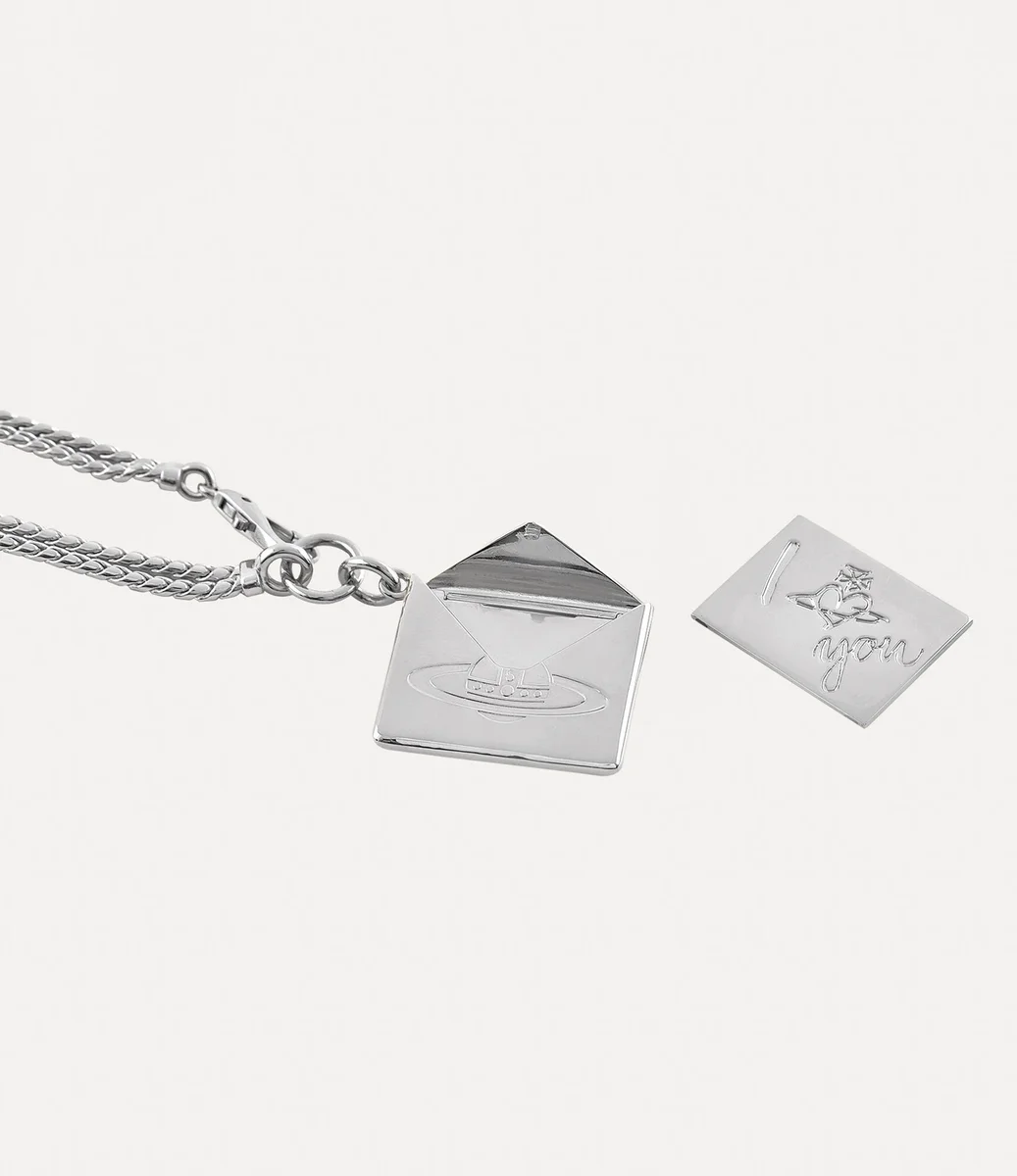 Náš náhrdelník s přívěskem ve tvaru valentýnské obálky má siluetu dvojitého řetízku vyrobeného ze stříbrného pokoveného kovu, zdobeného černými patinovými detaily. Na přední straně je náš charakteristický motiv koule, symbol Vivienniny vize přenesení tradice do budoucnosti, zatímco na zadní straně je vyryto logo vlajkové butiky Vivienne Westwood. Náhrdelník se otevírá a odhaluje uvnitř odlitý dopis s upřímným vzkazem „Miluji tě“.