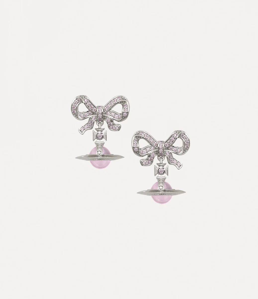 Naše náušnice Octavie mají design ve tvaru mašle inspirovaný georgiánskými šperky a jsou zdobeny pavé zasazenými třpytivými krystaly v růžových odstínech. Šperk obsahuje charakteristický trojrozměrný motiv visící koule, který je vyroben z platinového stříbra a uprostřed zdoben jemnou růžovou křišťálovou koulí.