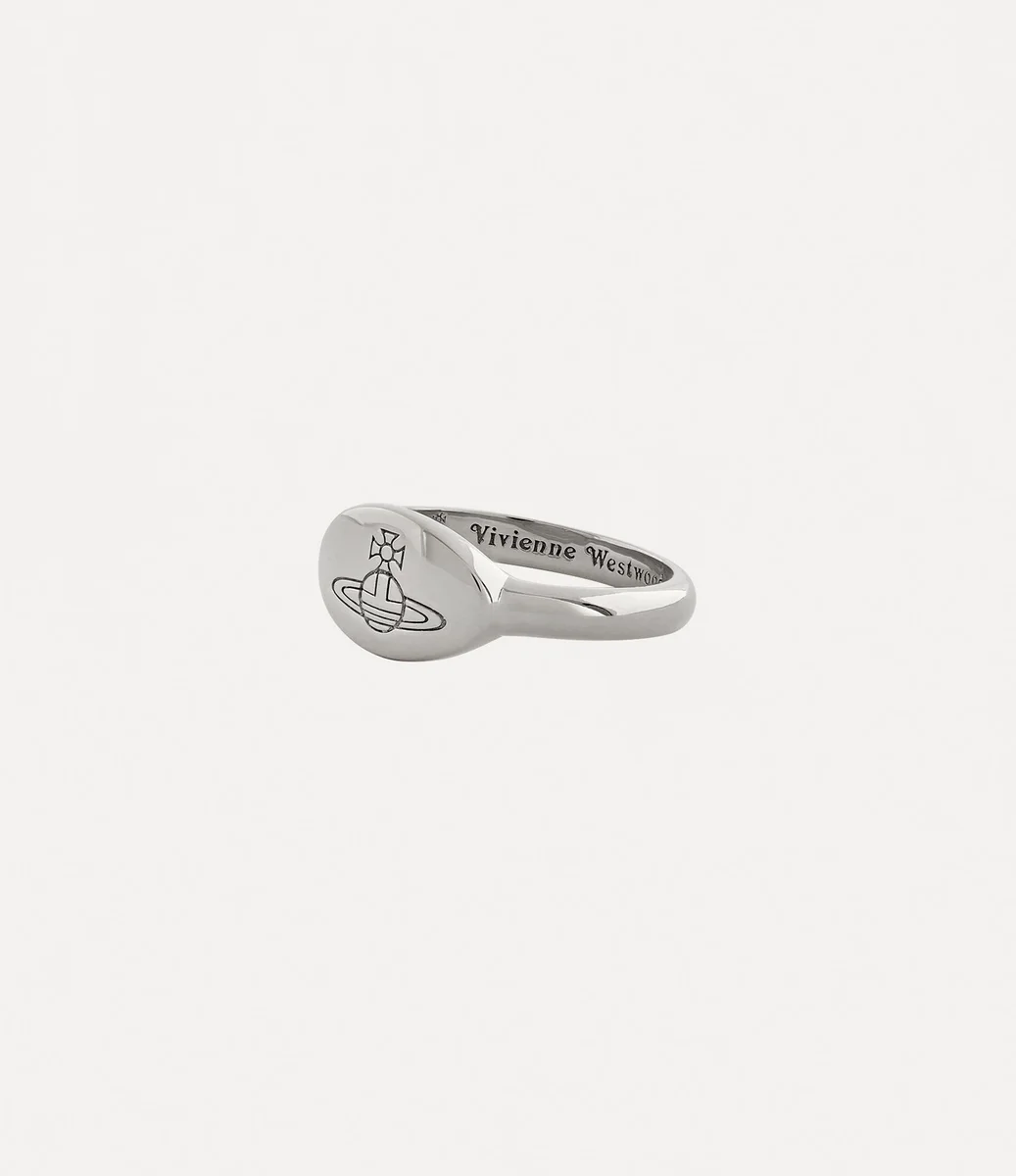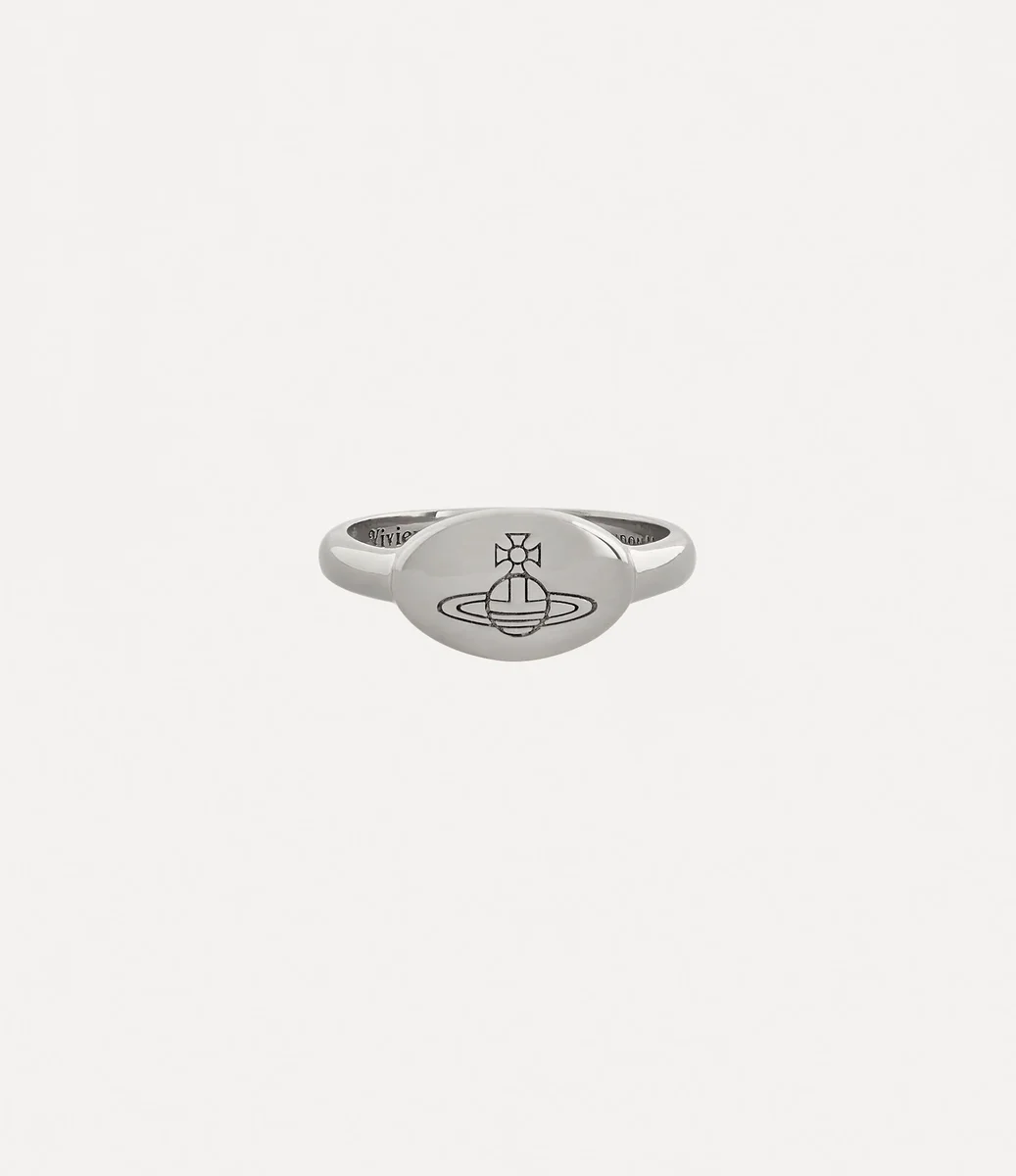 Náš prsten Tilly má klasický tvar pečetního prstenu, je vyroben z recyklovaného stříbra a má leštěnou platinovou povrchovou úpravu. V jeho středu je ručně malovaný motiv koule s černými smaltovanými detaily, který odráží vizi Vivienne Westwoodové o přenesení tradice do budoucnosti.
