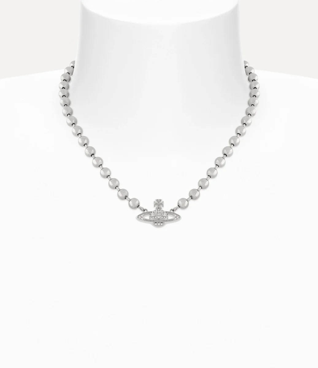 Náhrdelník Thames Mini Bas Relief se vyznačuje elegantním kulovým řetízkem a charakteristickým basreliéfním globem uprostřed, inspirovaným ikonickým motivem globu značky. Tento šperk, posázený krystaly v tónu, odráží vizi Vivienne přenést tradici do budoucnosti.
