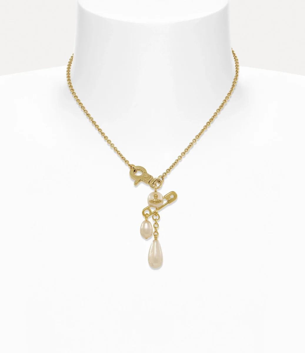 Náhrdelník Claude Small zdobí zaoblená perla s centrální koulí, doplněná charakteristickým detailem v podobě bezpečnostní sponky – odkazem na punkem inspirovaný, nonkonformní styl Vivienne. Z přívěsku elegantně visí perla a jemné řetízkové detaily, které dodávají designu pohyb, zatímco spona inspirovaná hardwarem umožňuje snadné zapínání.