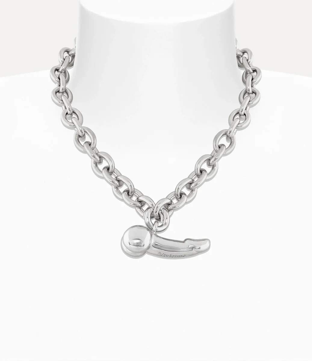 Náhrdelník Penis připomíná Viviennin obdiv k antickému umění, kde byl tento odvážný motiv často používán jako symbol plodnosti nebo síly. Náhrdelník je k dispozici v leštěném stříbrném provedení, doplněný robustním kabelovým řetízkem a bezpečným zapínáním.