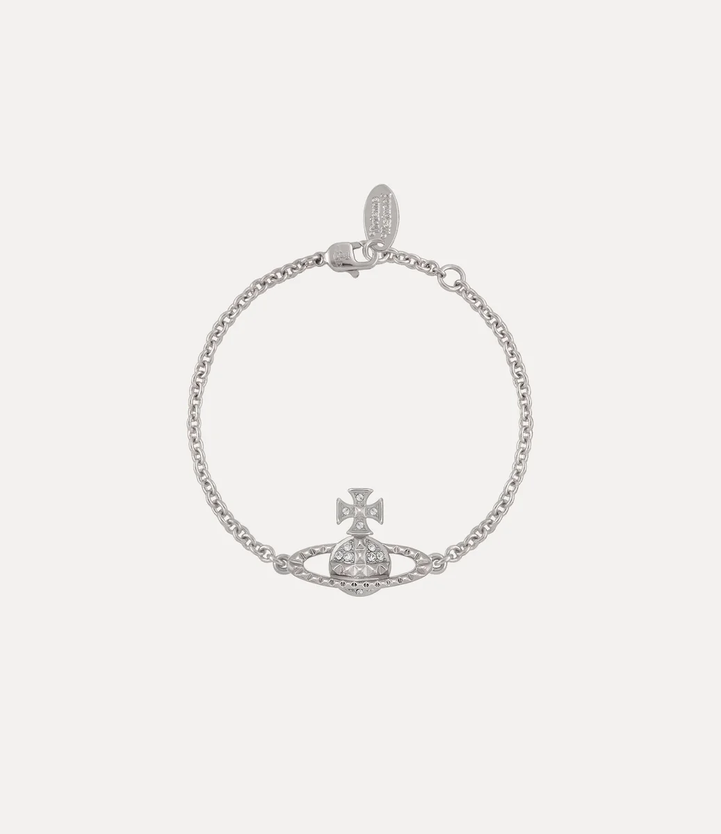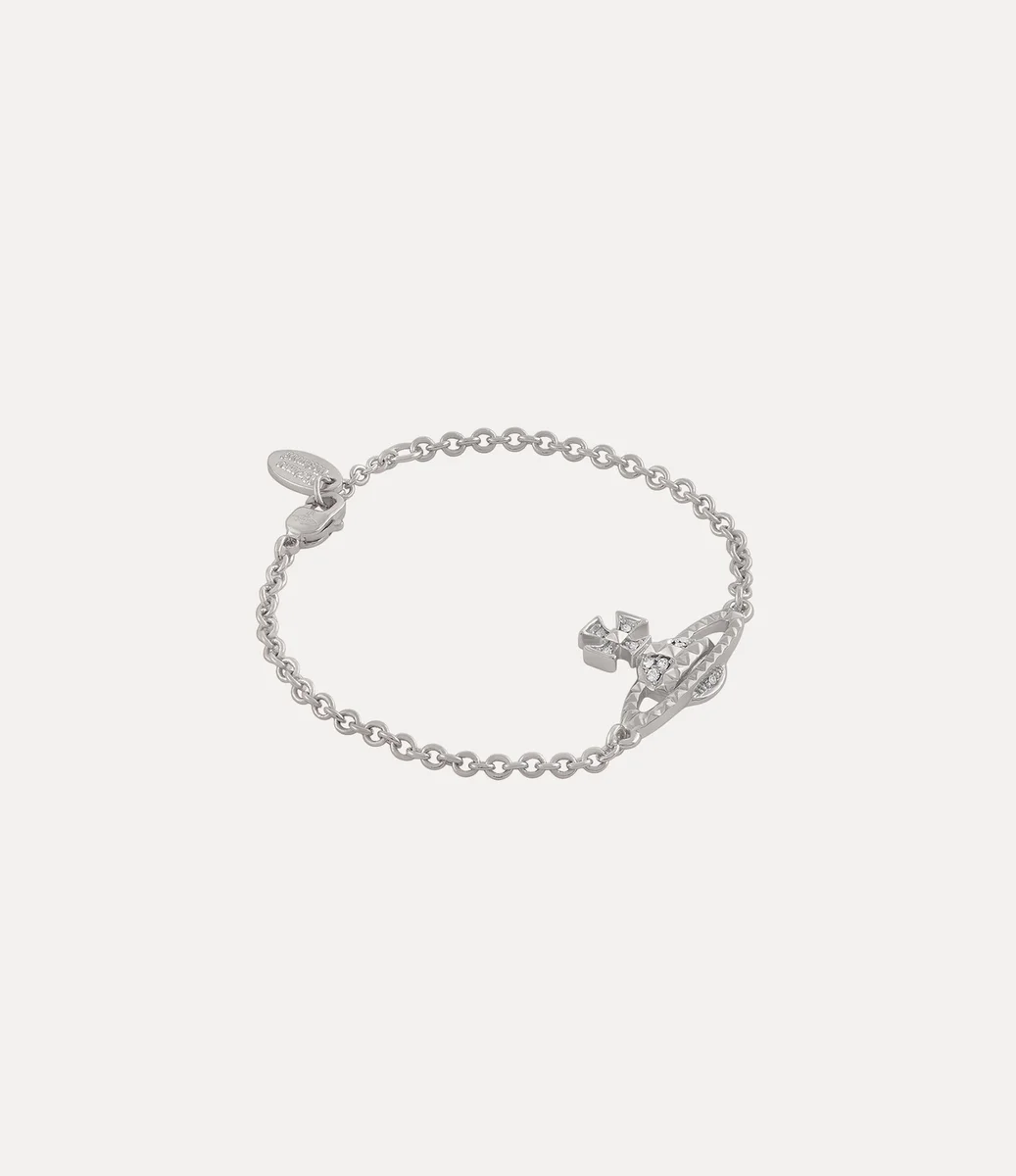 Náš náramek Mayfair Bas Relief byl pro tuto sezónu přepracován a doplněn o stříbrné pokovení a bílé krystalové ozdoby. Náramek, pojmenovaný podle londýnské čtvrti Mayfair, kterou Vivienne milovala, zdobí pyramidové cvočky a náš basreliéfní motiv koule.