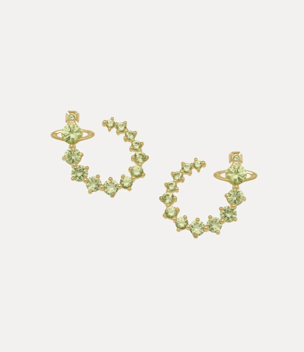 Naše náušnice Lydia jsou vyrobeny z leštěného pozlaceného kovu a jemně se zakřivují kolem ušního lalůčku, čímž vytvářejí iluzi sochařského kruhu. Jsou zdobeny kubickými zirkoniemi, které se elegantně zužují, a doplněny naším nadčasovým emblémem ve tvaru koule, který připomíná Vivienninu vizi přenesení tradice do budoucnosti.