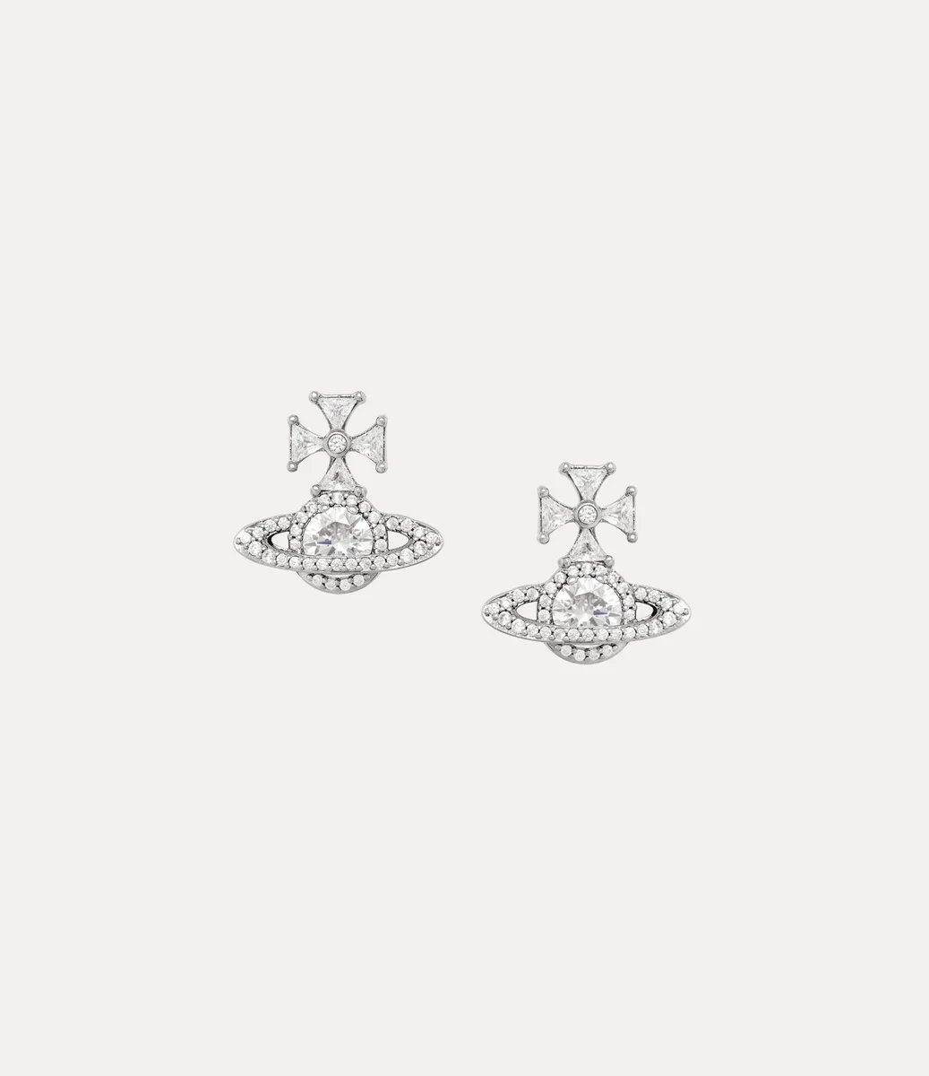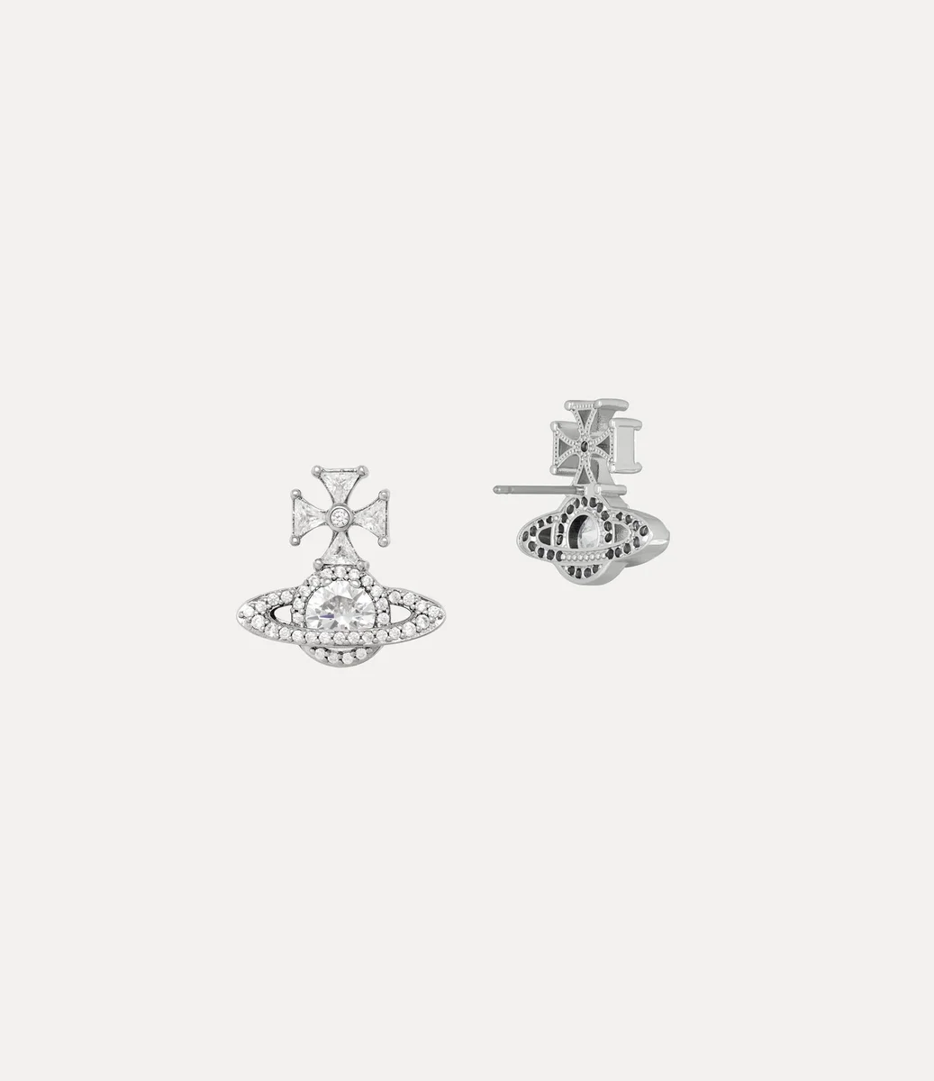 Náušnice Mila jsou vyřezány do našeho charakteristického motivu koule a ztělesňují vizi Vivienne Westwoodové, která chce tradici přenést do budoucnosti. Každý kus je pokovený stříbrnou barvou a zdobený trojúhelníkovými broušenými krystaly v horní části, které zdůrazňují jemný křížový detail.