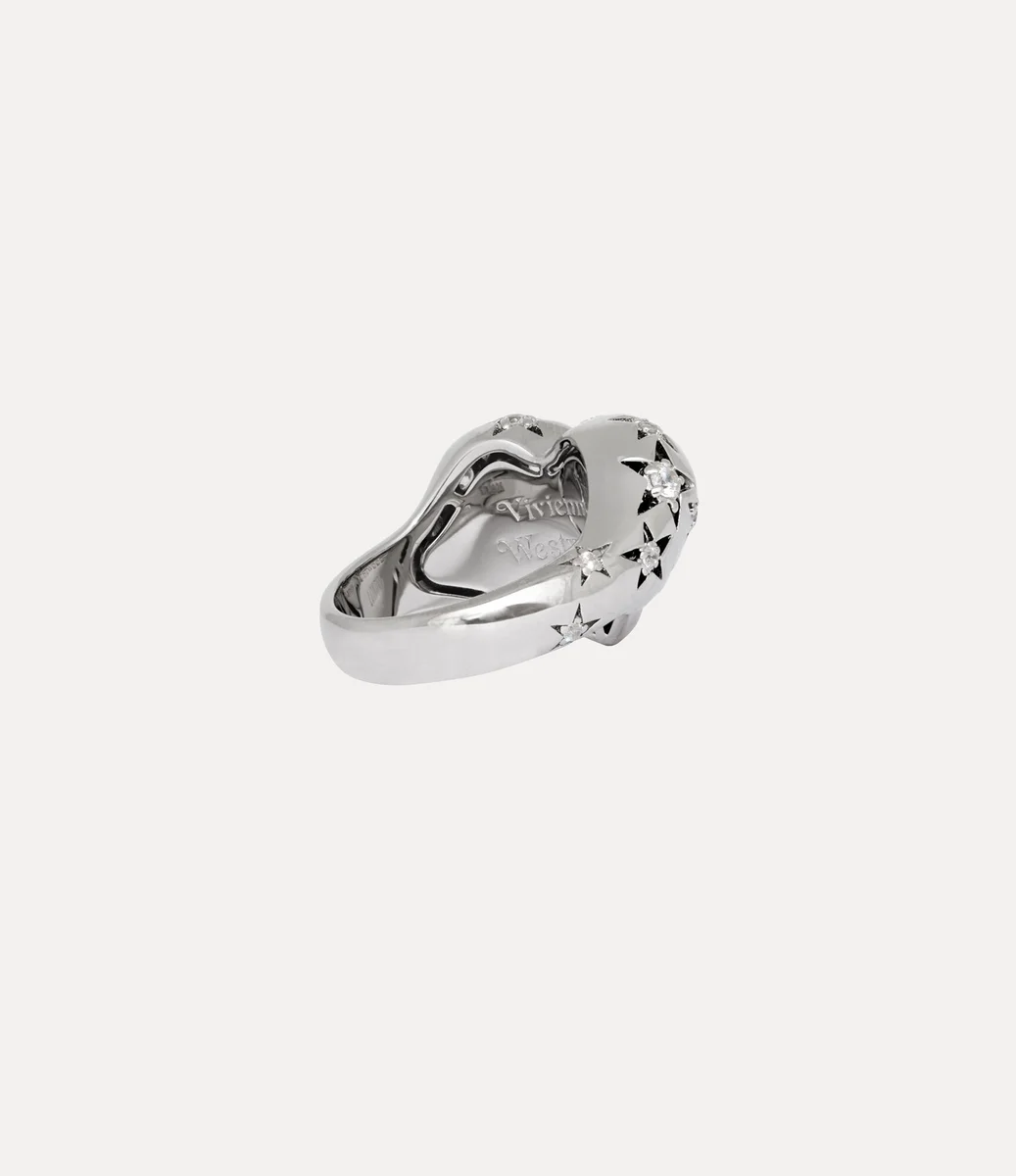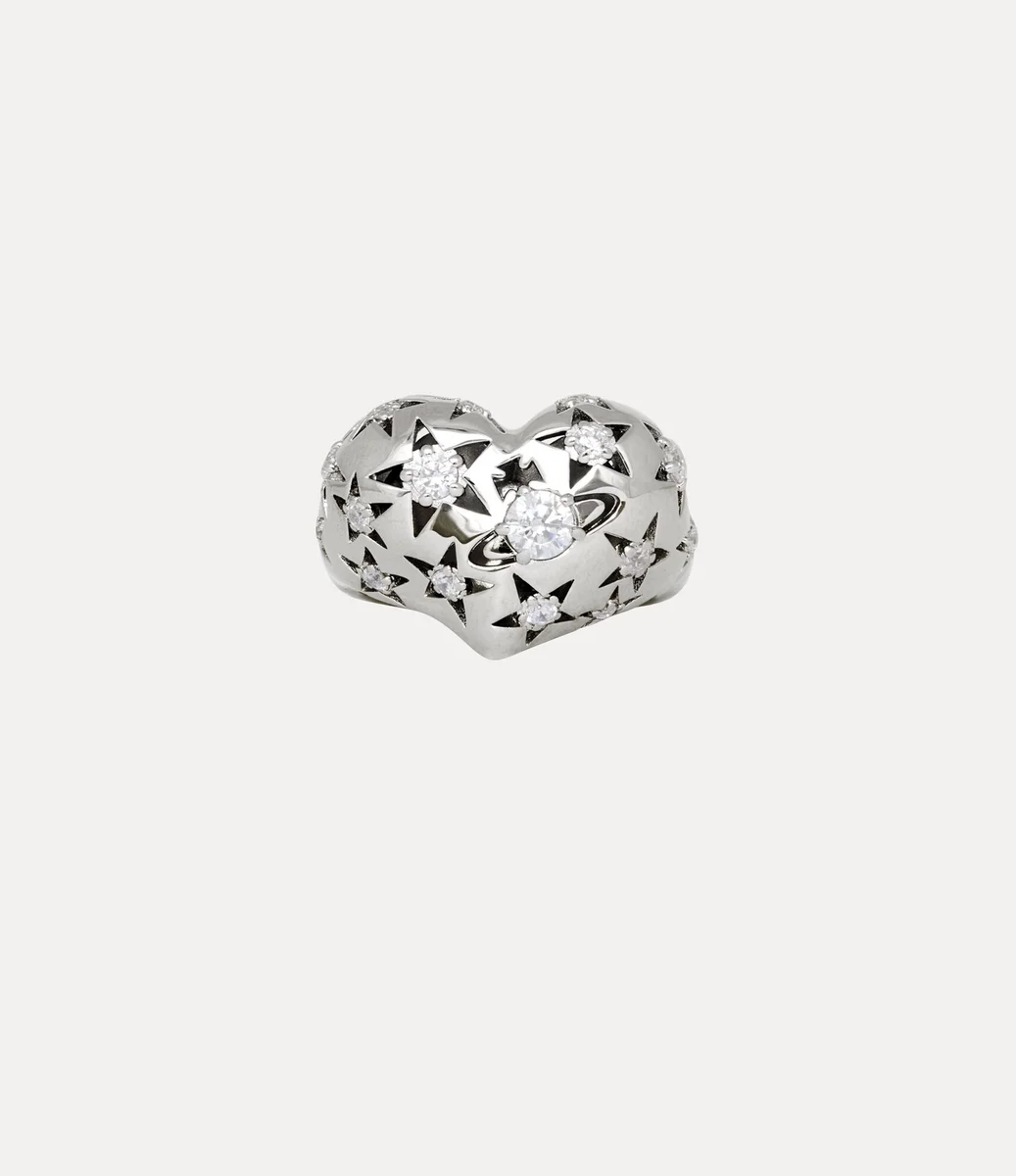 Náš prsten Lee je vyroben z recyklovaného stříbra a má zářivou platinovou povrchovou úpravu. Přední strana má tvar asymetrického srdce, což je odkaz na Vivienninu lásku k lidstvu a planetě, a je zdobena krystaly ve tvaru hvězd a koulí rozptýlených po celé ploše.