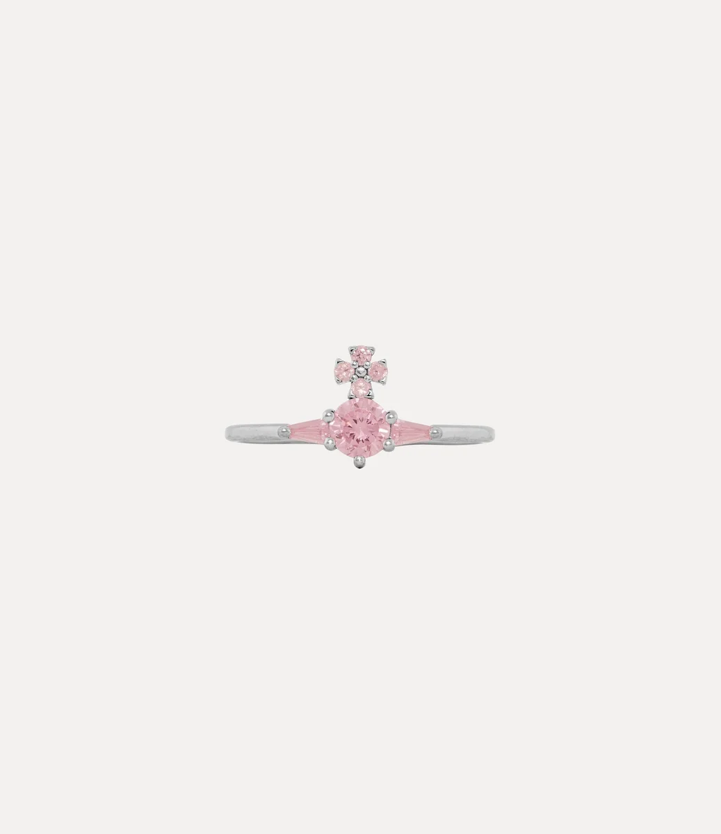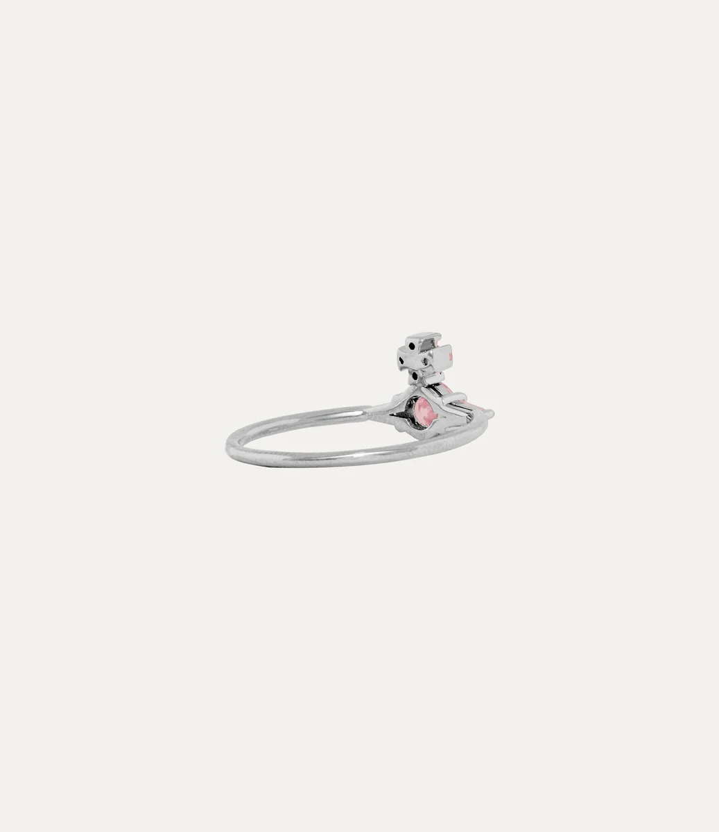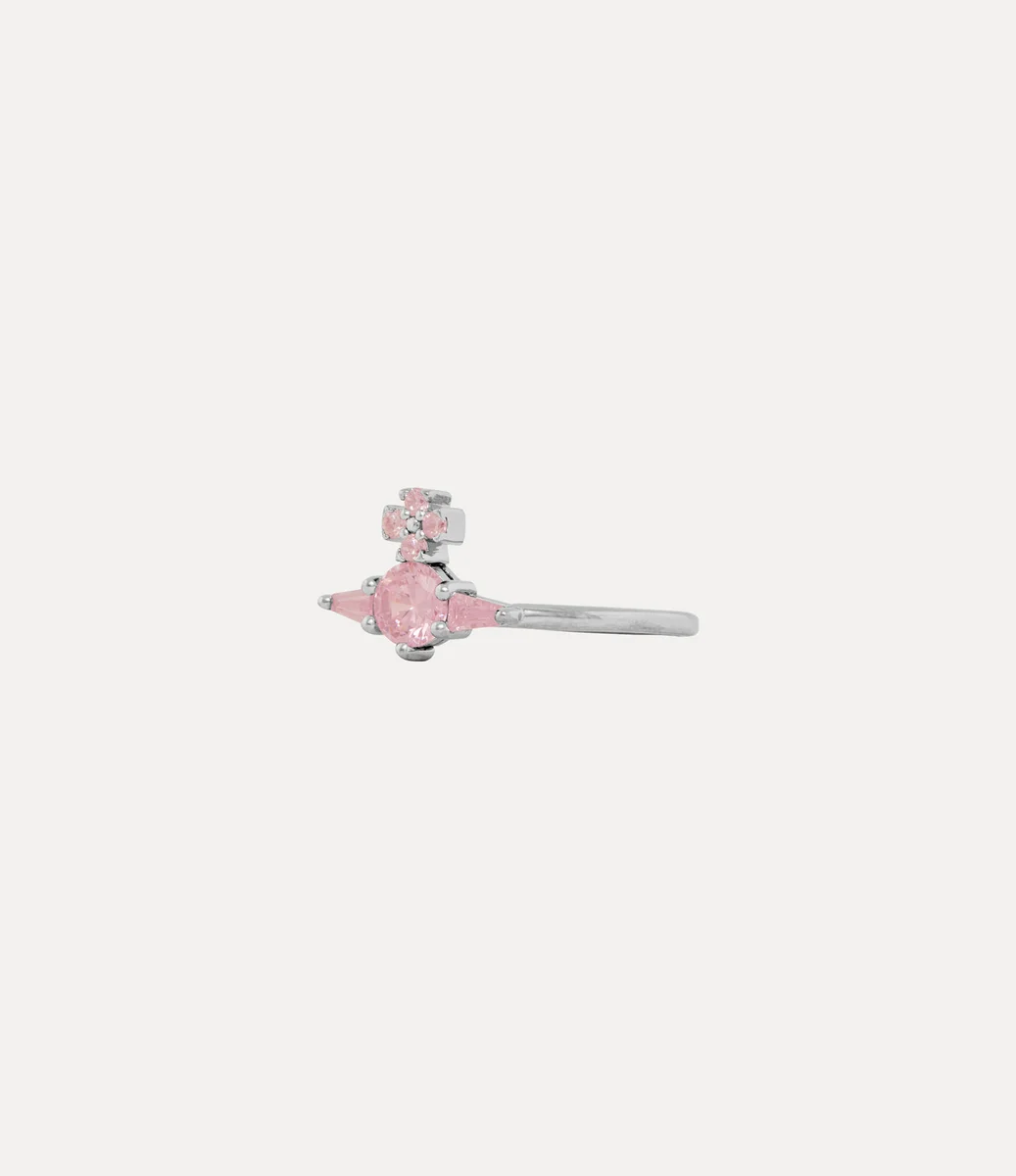 Náš prsten Ofelia je vyroben z platinového stříbra a uprostřed zdobí jemný motiv koule, inspirovaný charakteristickým emblémem značky. Design je osazen kulatým růžovým krystalem, obklopeným zúženými bagetovými krystaly a pavé detaily na křížové špičce, které ztělesňují Vivienninu vizi přenesení tradice do budoucnosti.