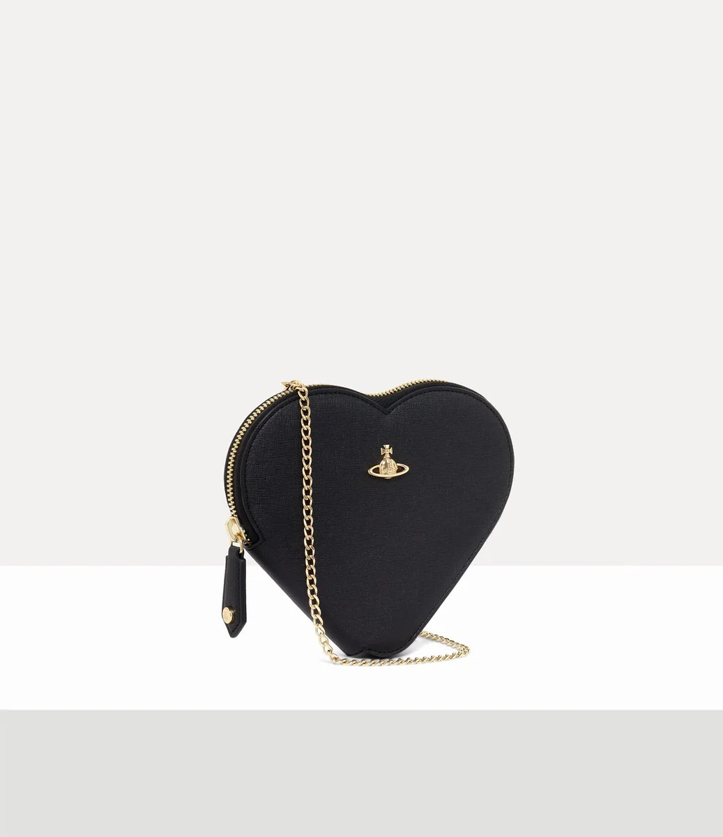 Taška New Heart Crossbody má tvar srdce, který připomíná Vivienninu lásku k lidstvu i planetě. Na přední straně tašky je motiv světle zlaté koule, který symbolizuje tradici, obklopený nebeskými prstenci Saturnu, které představují budoucnost.
