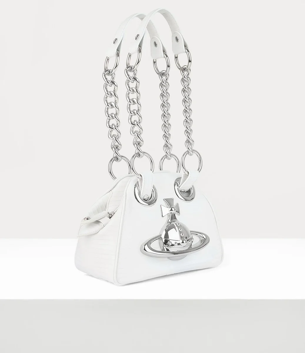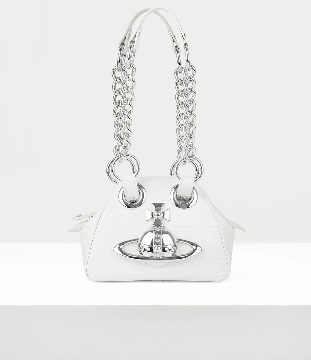 Naše kabelka Archive Orb Chain, která se poprvé objevila v kolekci Vivienne Westwood Jaro–Léto 1991 „Cut, Slash & Pull“, byla v této sezóně přepracována do „mini“ verze z reliéfní kůže s efektem krokodýlí kůže. Kabelka má na předním panelu velký trojrozměrný motiv koule, doplněný o bondage inspirované kroužky a řetízkové detaily podél popruhů.