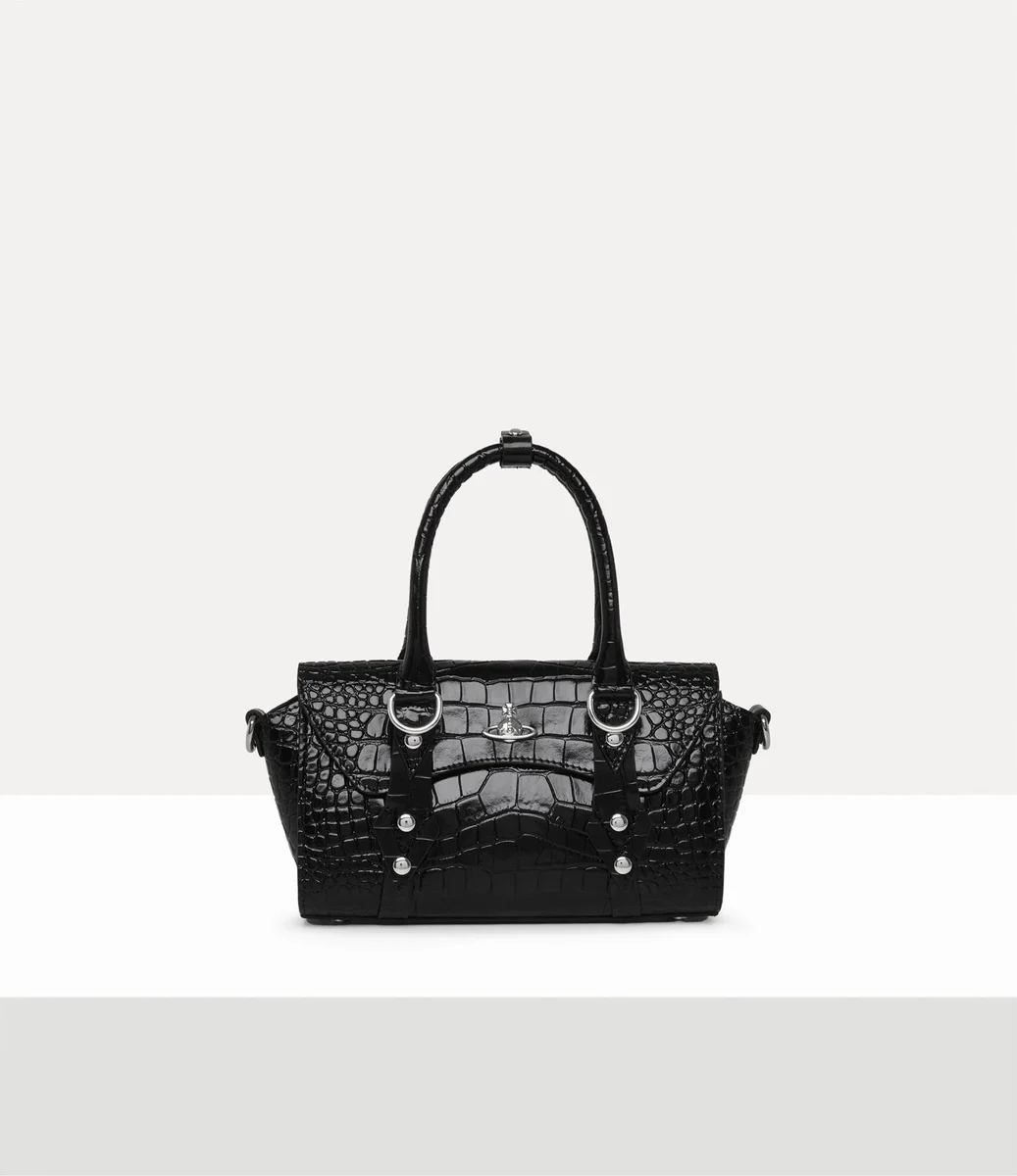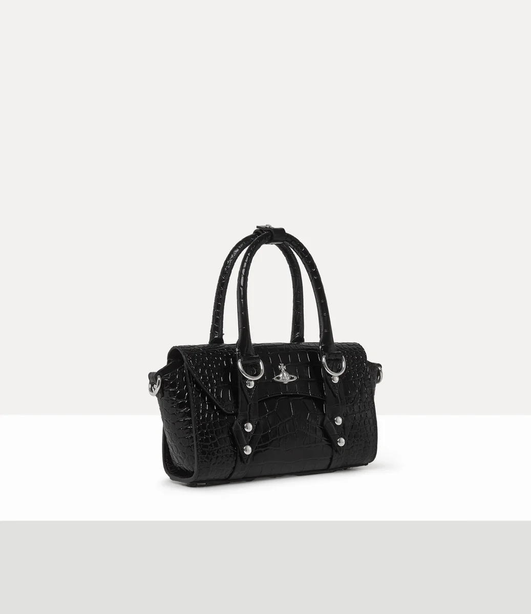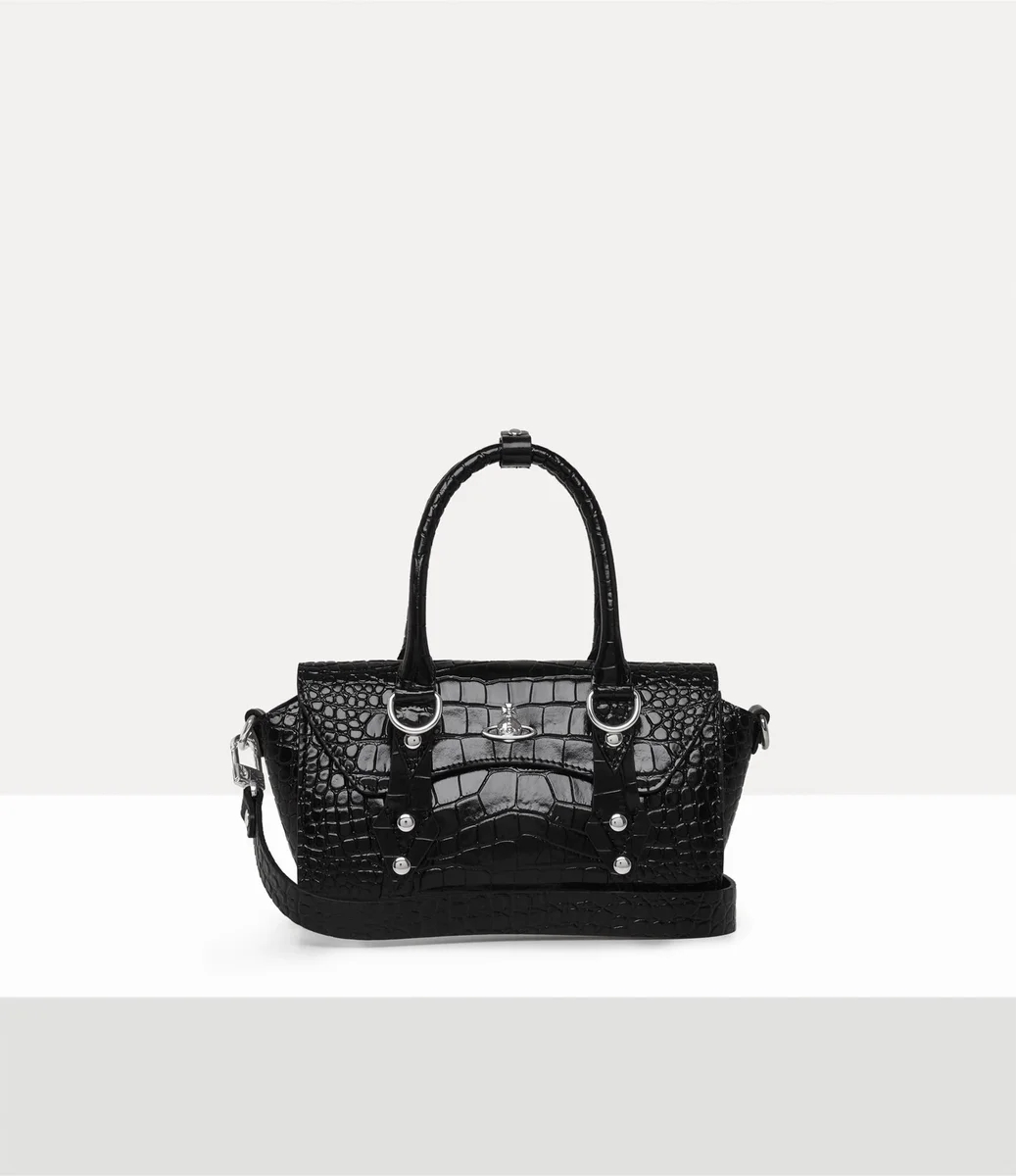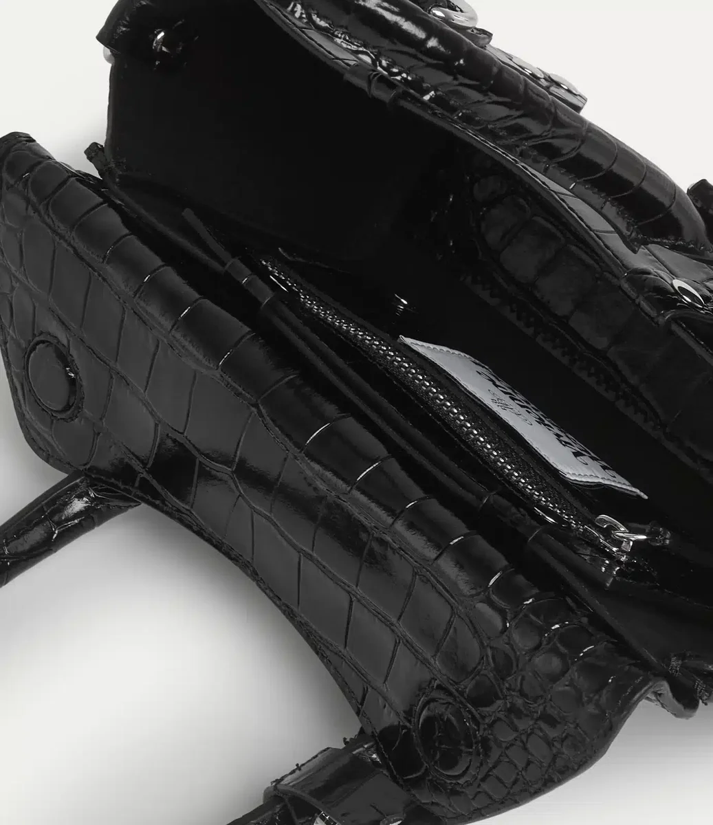 V této sezóně je naše charakteristická kabelka Bettina Mini crossbody vyrobena z měkké kůže se složitým reliéfním povrchem s efektem mini krokodýlí kůže. Design inspirovaný řadou „Betty“ této značky je doplněn detaily v podobě kovových prvků inspirovaných bondage a stříbrným D-kroužkem pro přizpůsobitelné přívěsky.