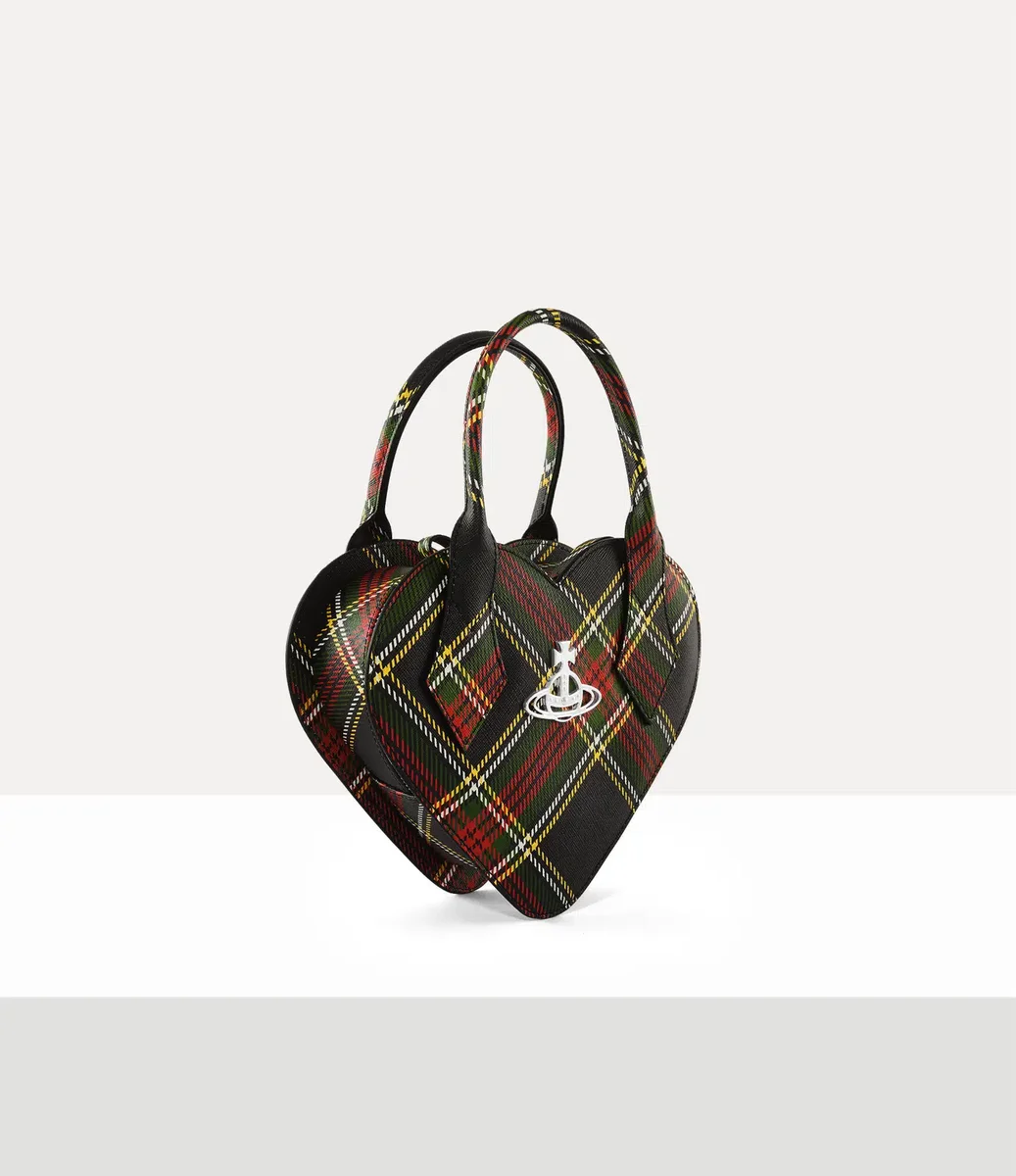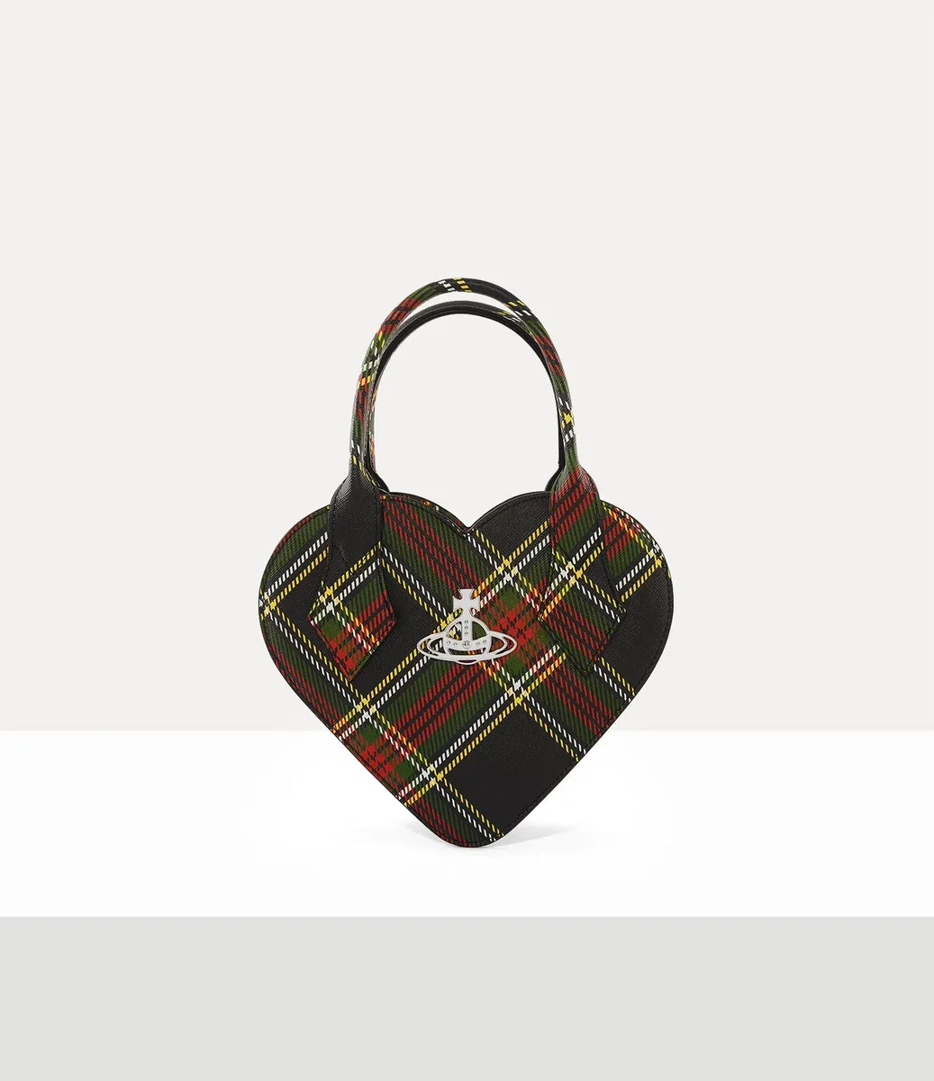 Naše kabelka Josephine Heart crossbody má ikonický tvar srdce v provedení z PU kůže s potiskem tartanu „Chelsea“. Kabelka se vyznačuje výraznými barvami a klasickými kovovými detaily, přední část zdobí leštěná kovová koule a vnitřek je vyložen charakteristickou podšívkou s motivem britské vlajky, která je poctou kolekci „Anglophilia“ z podzimu/zimy 2002.