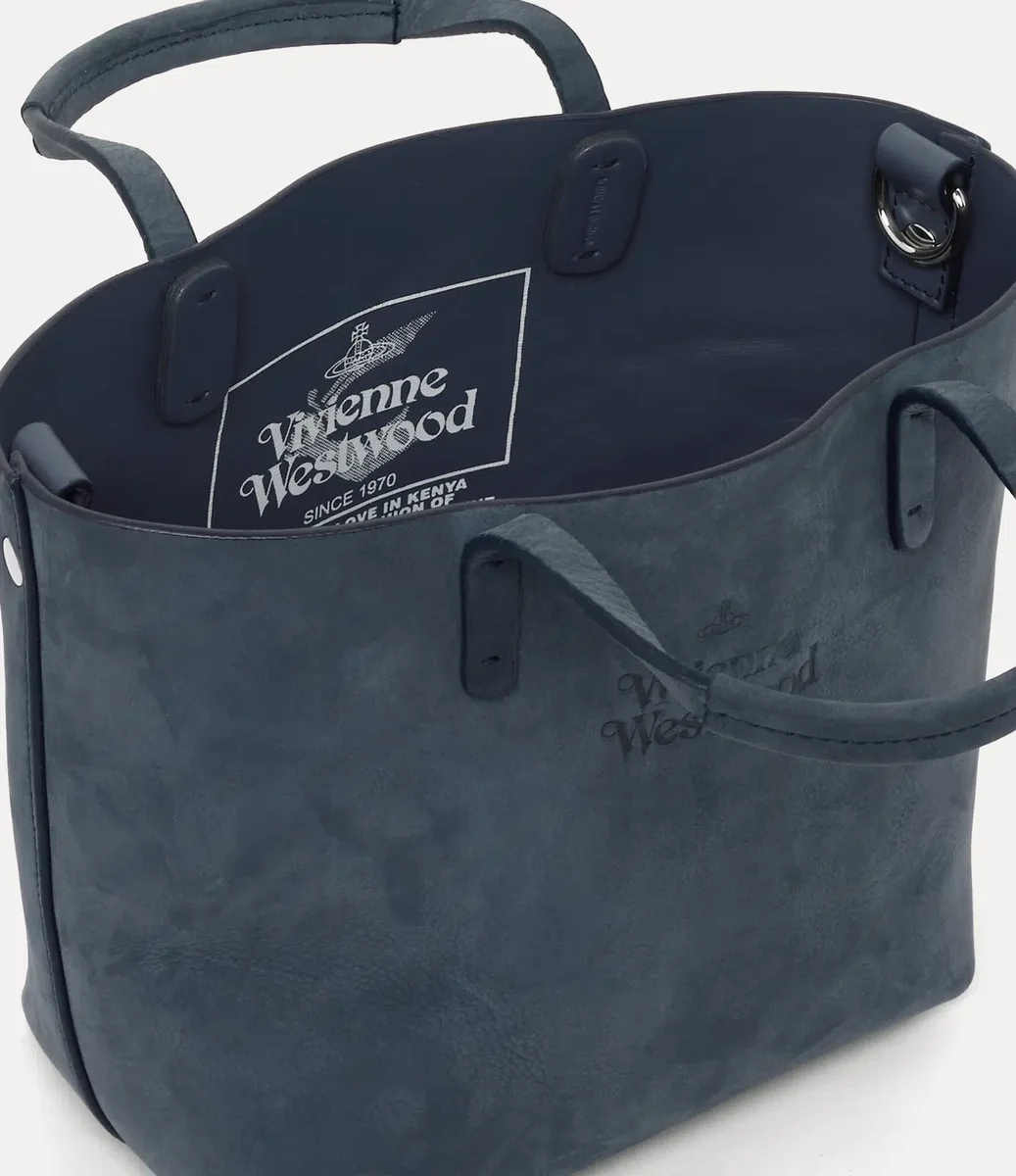 Naše taška Studio Small shopper je součástí kolekce Made in Kenya, která byla vyrobena ve spolupráci s Ethical Fashion Initiative. Taška má modrou nubukovou kůži a reliéfní přední panel s charakteristickým motivem koule a písmen značky.