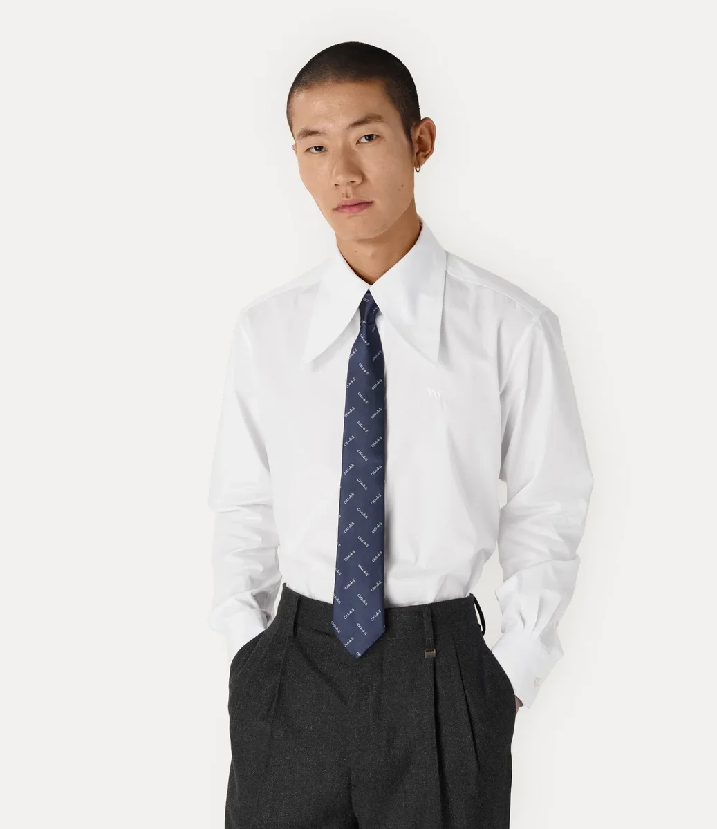 Naše hedvábná kravata má široký lem, který se zužuje do klasického špičatého konce. Design je doplněn charakteristickým sloganem značky „CHAOS“, který se opakuje po celé ploše a zachycuje rebelského ducha Vivienne a její odhodlání bojovat proti politickým konvencím.