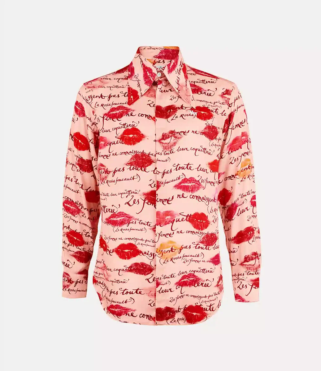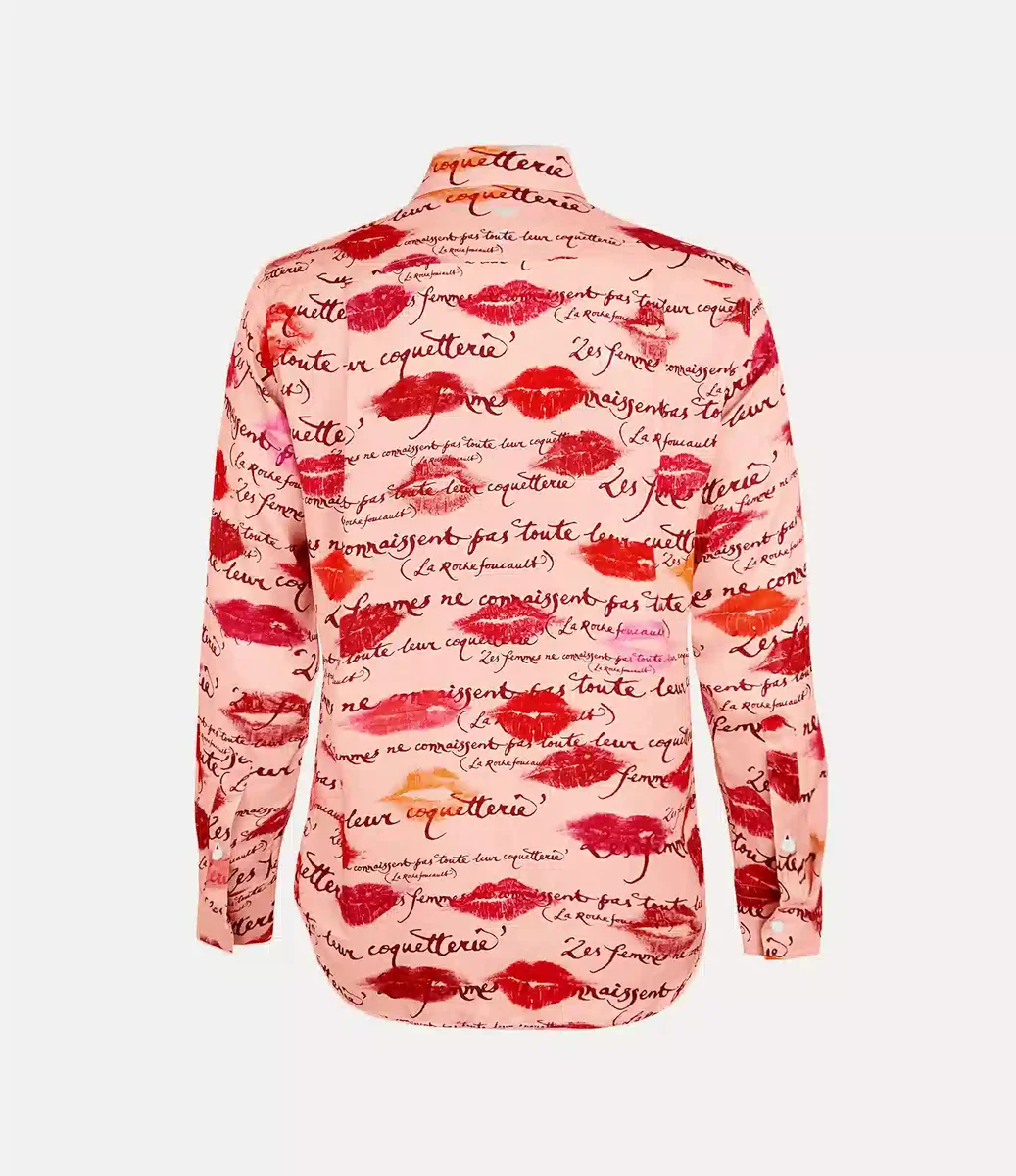 Naše smokingová košile má výrazný špičatý límec a skrytou knoflíkovou légu. Je zdobena motivem „Kisses“, inspirovaným obalem našeho parfému „Boudoir“, doplněným Vivienniným ručně psaným motivem „Les Femmes Ne Connaissent Pas Toute Leur Coquetterie“.