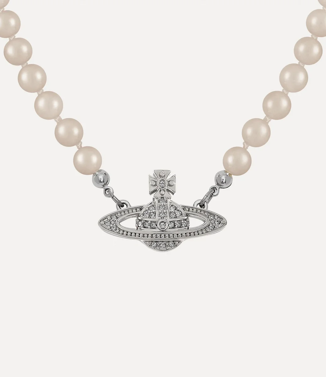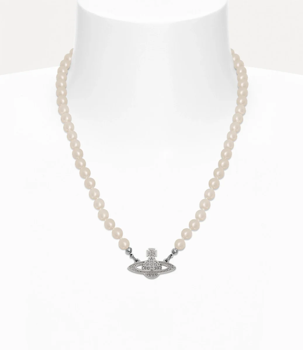 Perly zůstávají nezbytným prvkem ikonografie značky a připomínají pocit dávného luxusu. Náhrdelník Man. Mini Bas Relief Pearl má řetízek ze skleněných perel a uprostřed je zdoben plochou koulí pokrytou krystaly, která připomíná vizi Vivienne přenést tradici do budoucnosti.