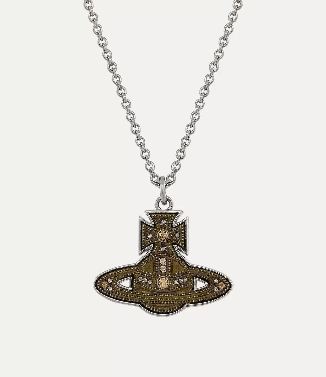 Náš přívěsek Laszlo má uprostřed designu motiv ve tvaru koule a je doplněn povrchovou úpravou z neoxidované mosazi, která mu dodává antický vzhled. Design se vyznačuje strukturovaným povrchem, který doplňují křišťálové detaily, které zdůrazňují prsten Saturn, postroj a křížový vršek.
