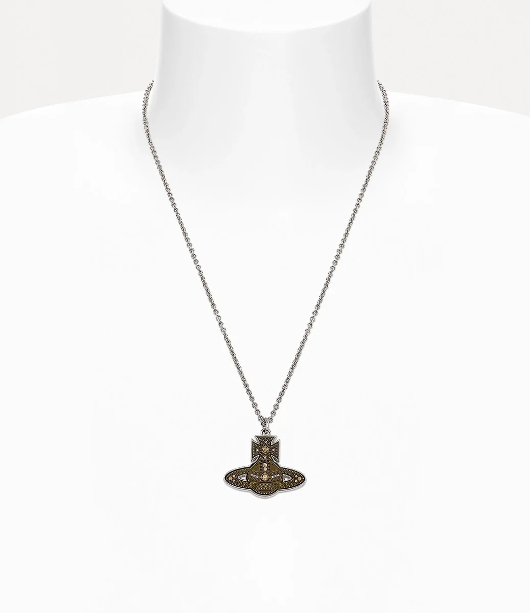 Náš přívěsek Man. Laszlo má uprostřed designu motiv ve tvaru koule a je doplněn oxidovanou mosaznou povrchovou úpravou, která mu dodává antický vzhled. Design se vyznačuje strukturovaným povrchem, který doplňují krystalové detaily, které zdůrazňují prsten Saturn, postroj a křížový vrchol.